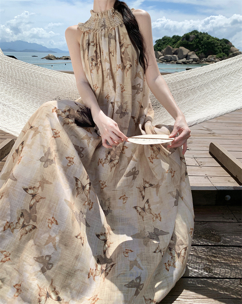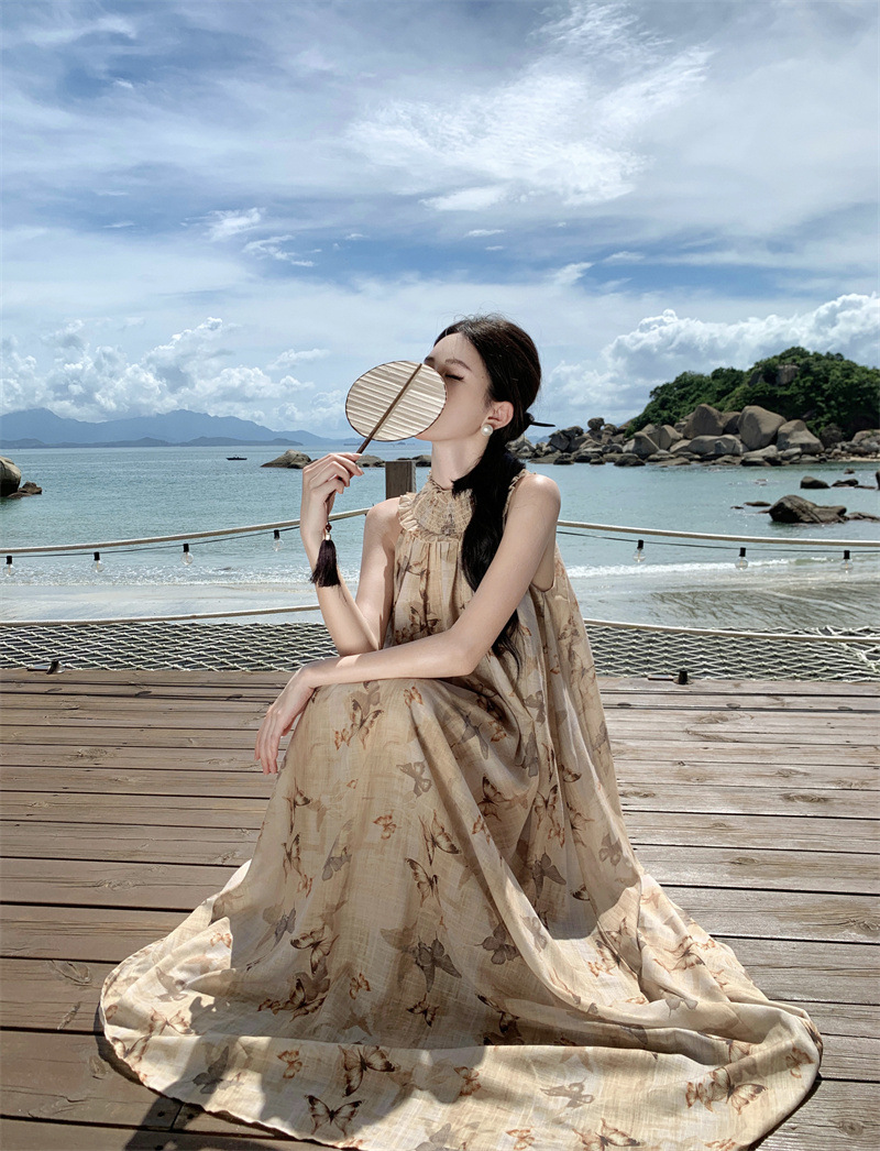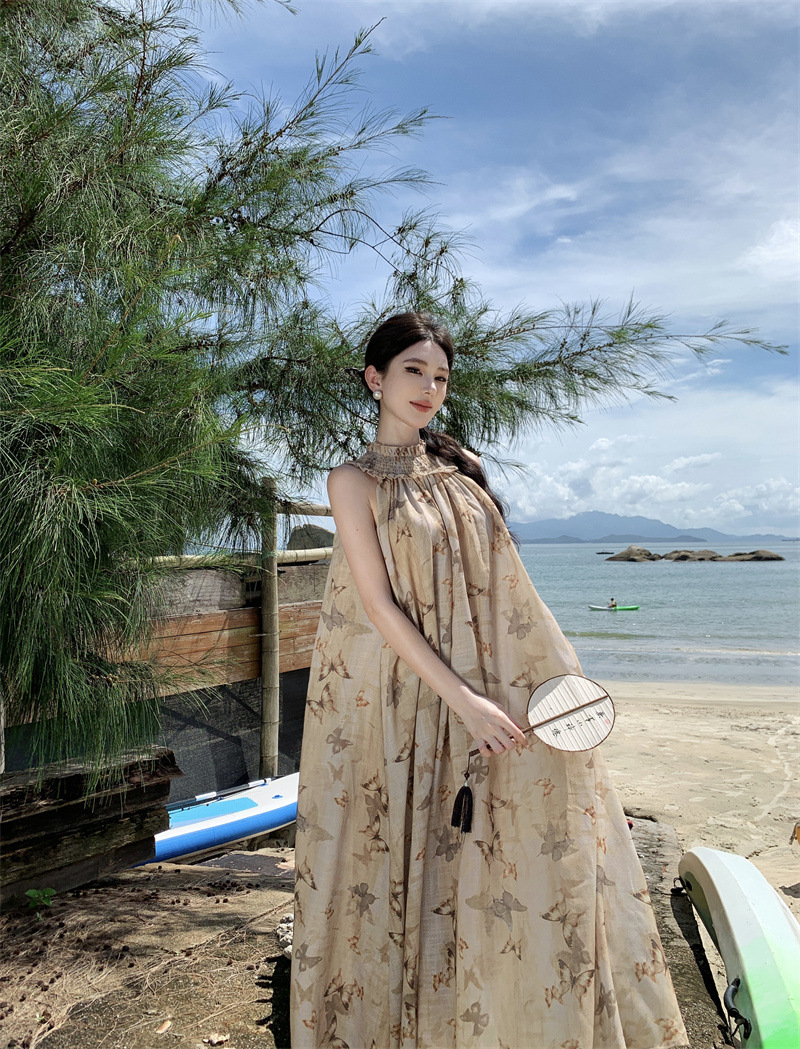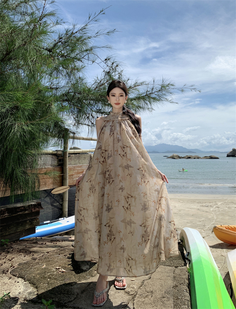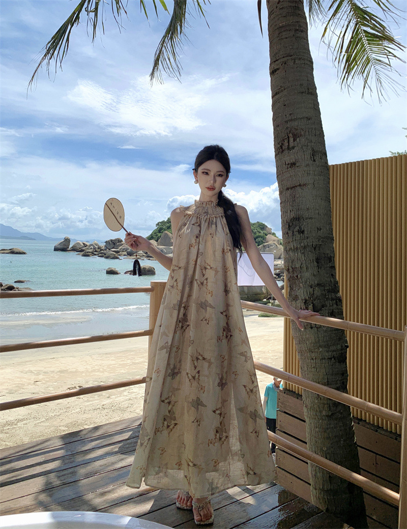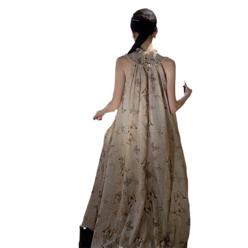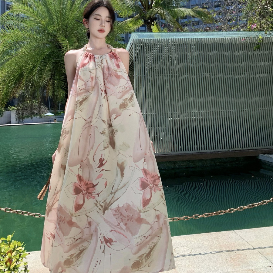 小众设计法式挂脖串珠连衣裙宽松极简印花吊带长裙