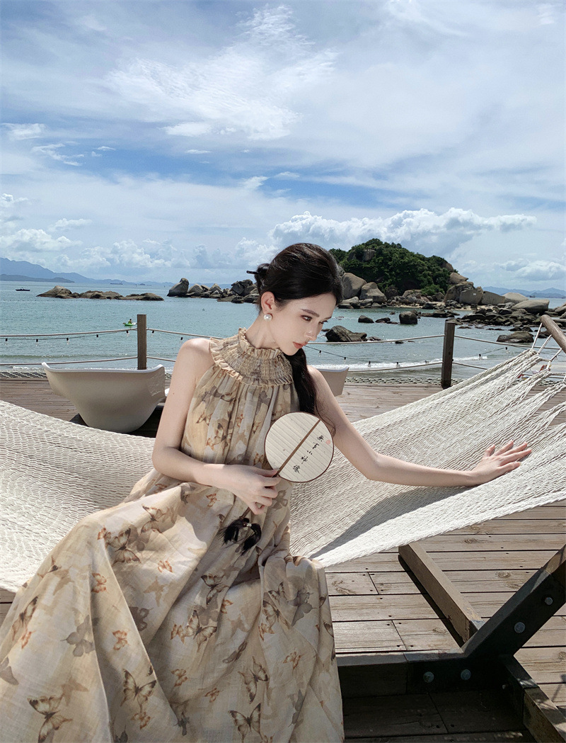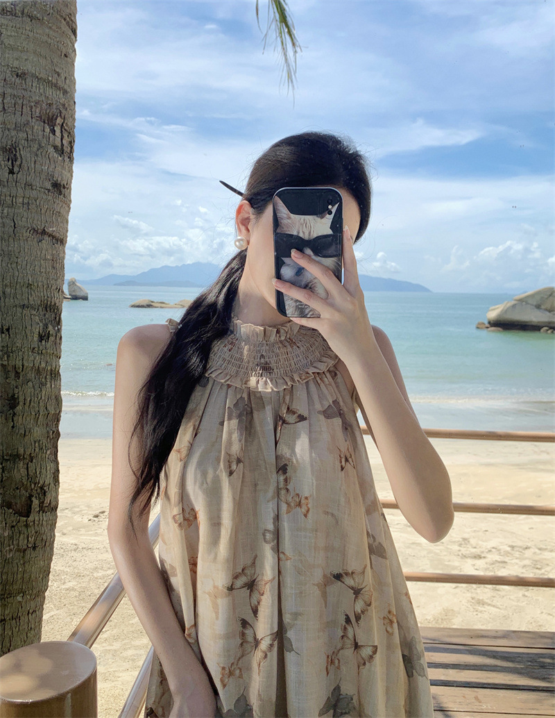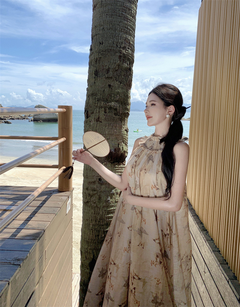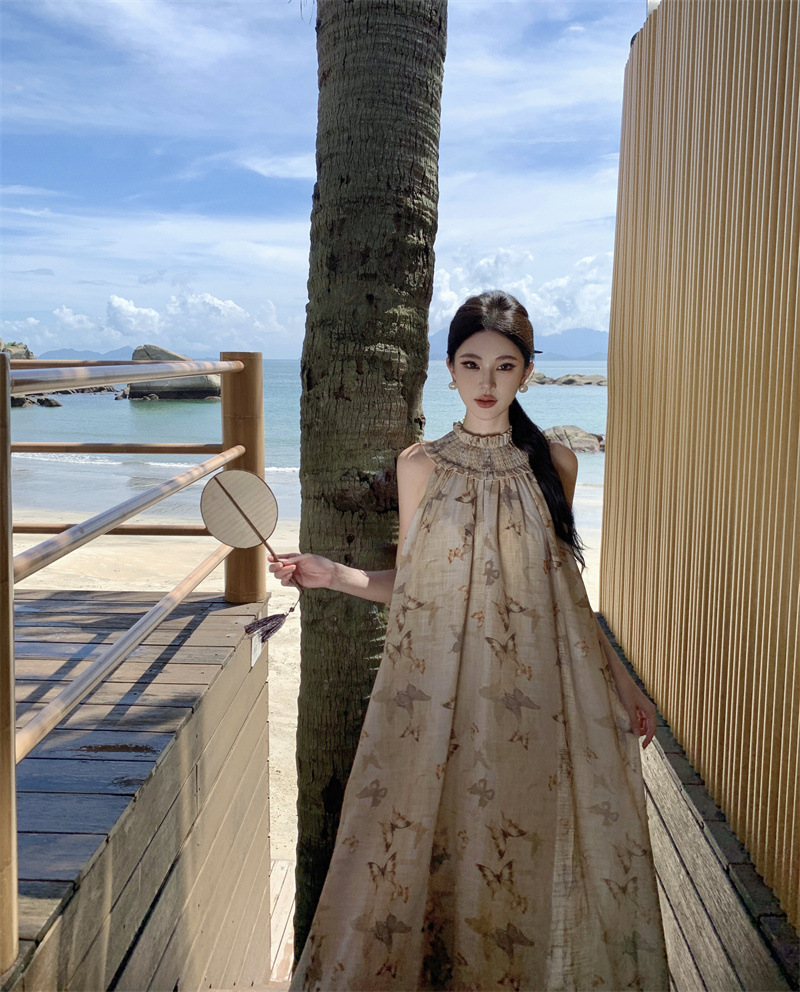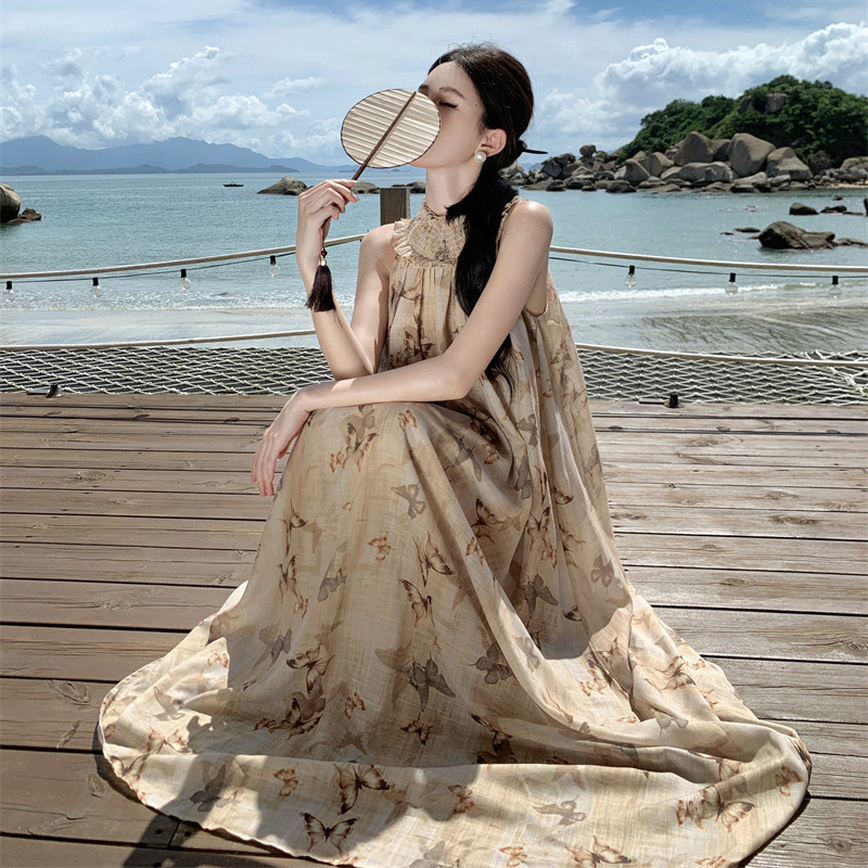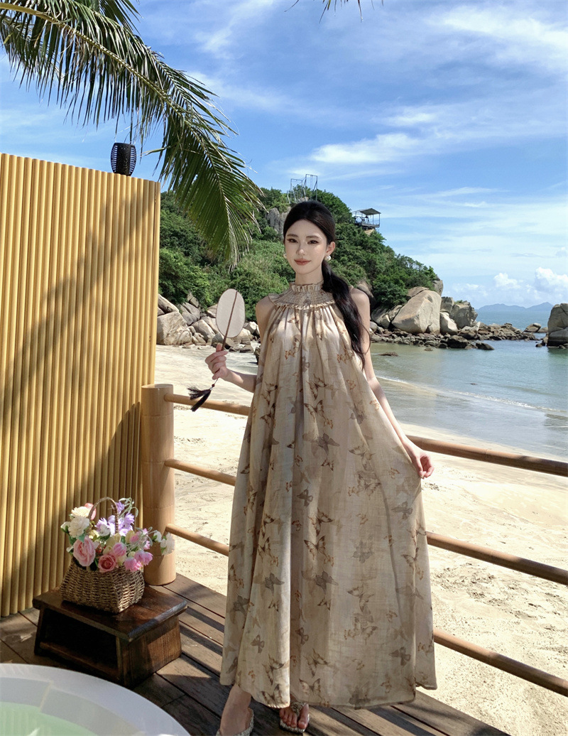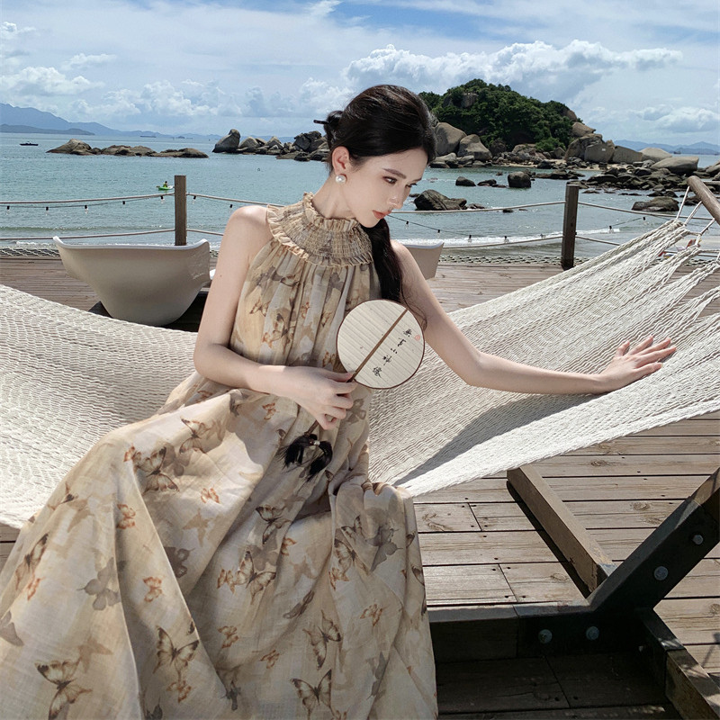 小众设计法式挂脖串珠连衣裙宽松极简印花吊带长裙