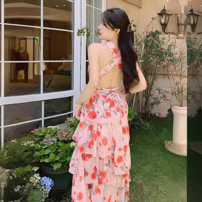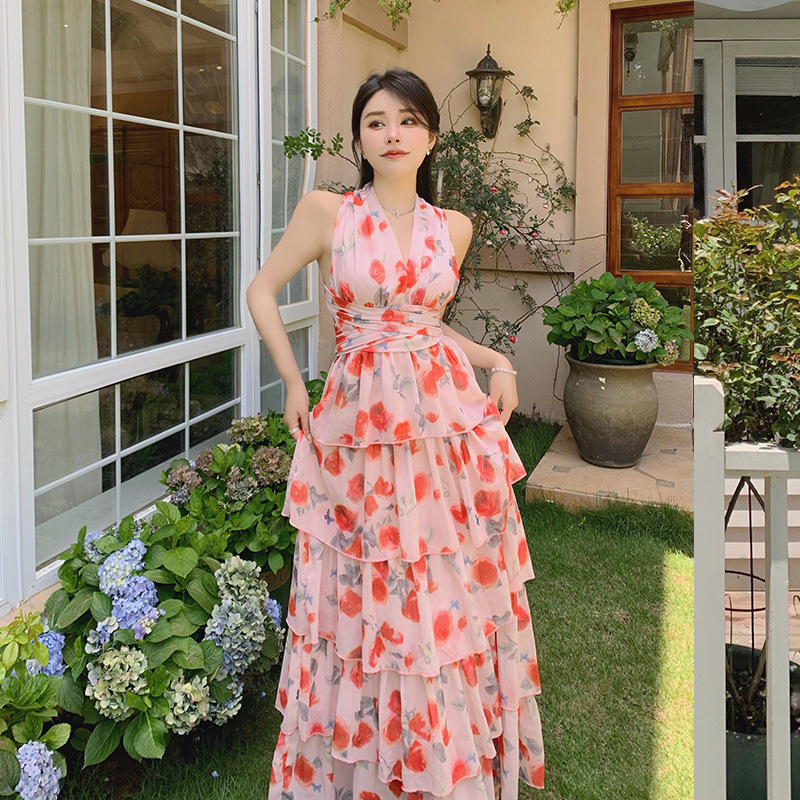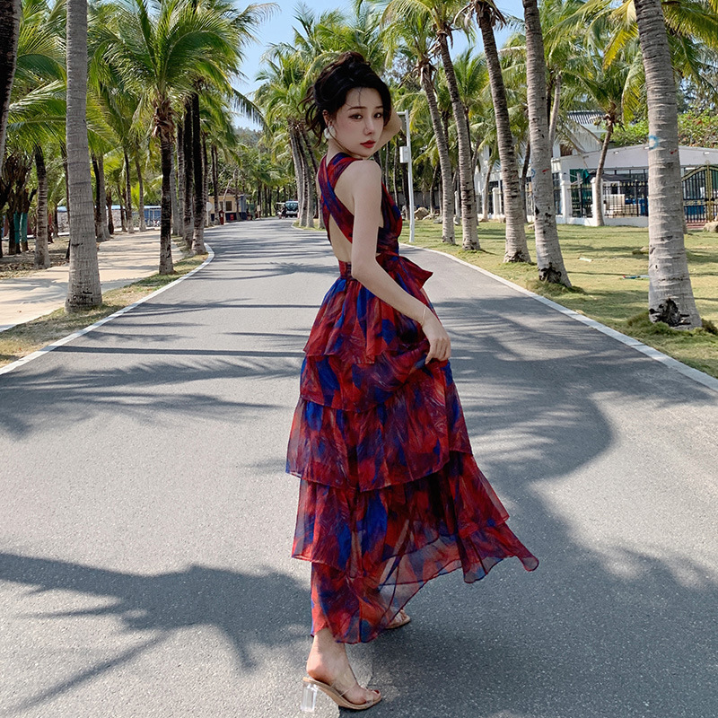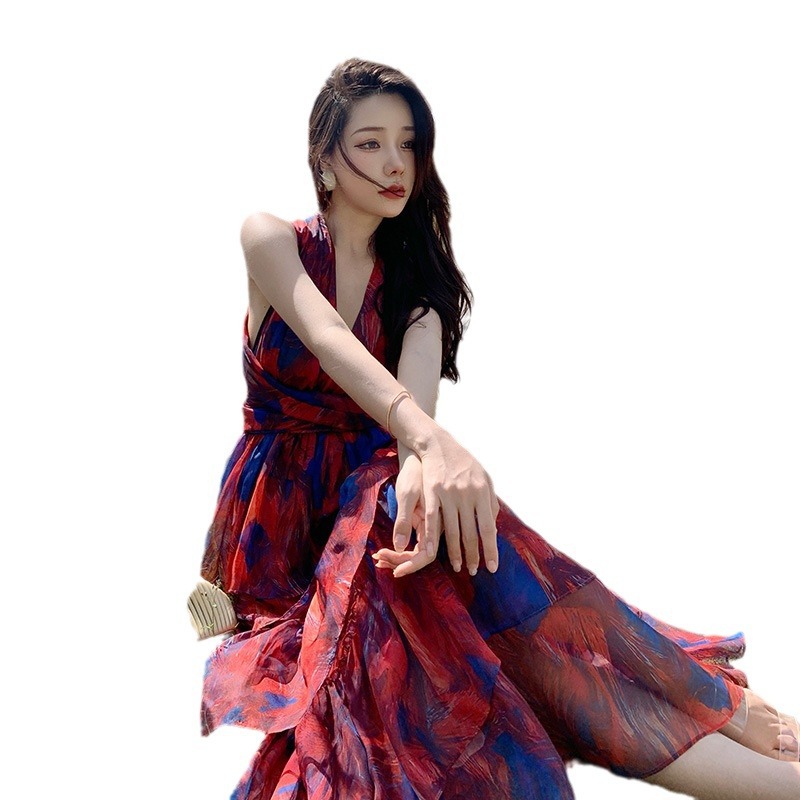 法式海边V领印花度假连衣裙高腰小众沙滩度假长裙