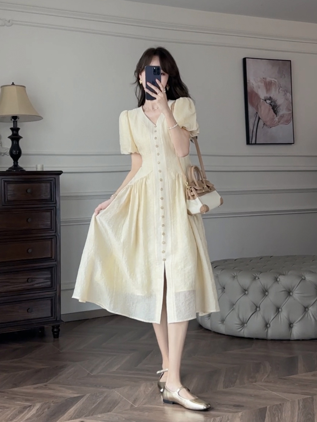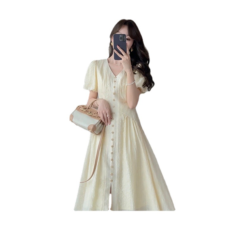 夏季新品茶歇法式温柔风浅黄色提花高级感泡泡袖连衣裙女