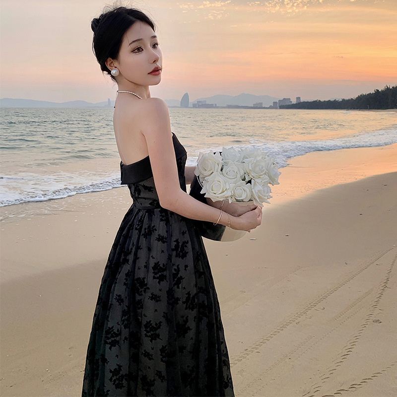 法式复古赫本风抹胸连衣裙黑色提花氛围感海边度假连衣裙