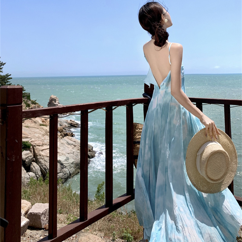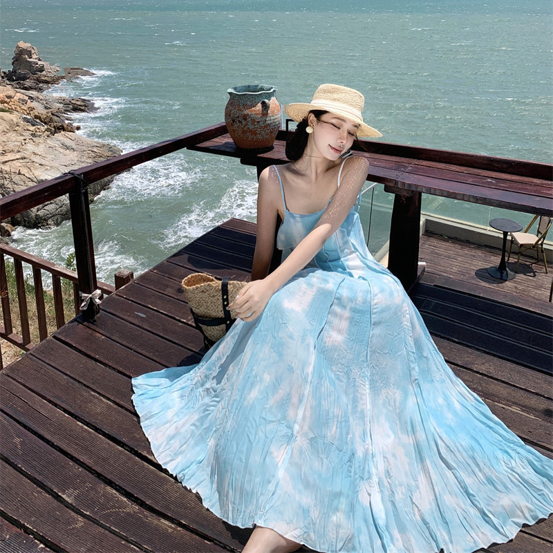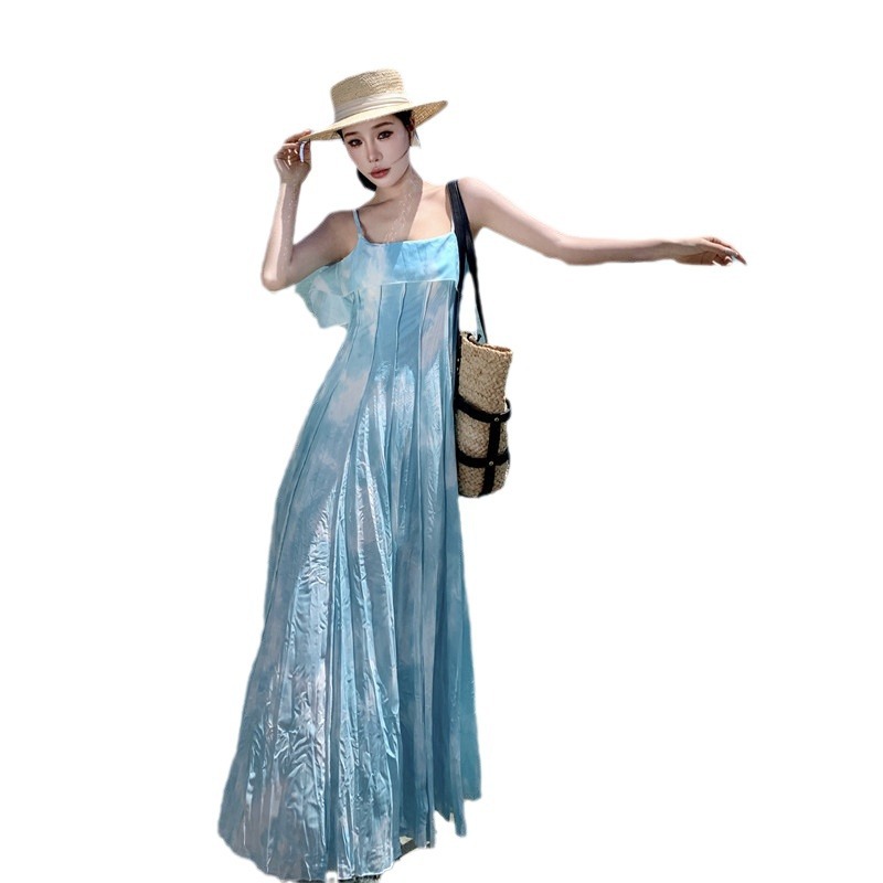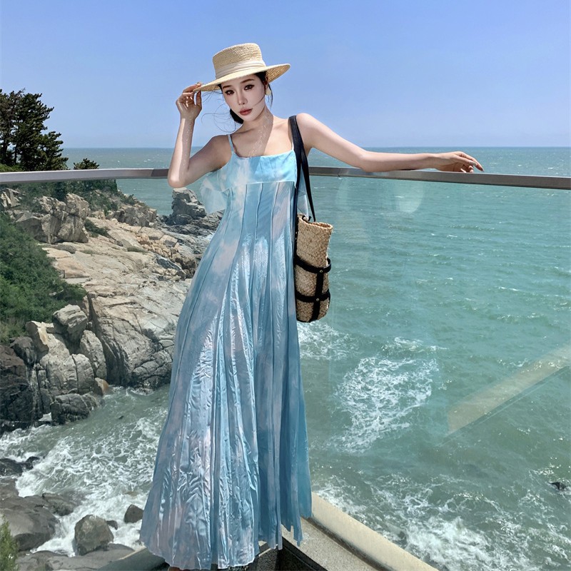 度假海边拍照绝美出片的大裙摆吊带连衣裙多巴胺沙滩裙