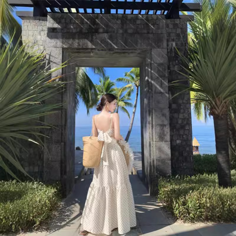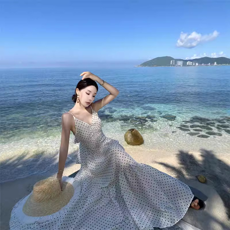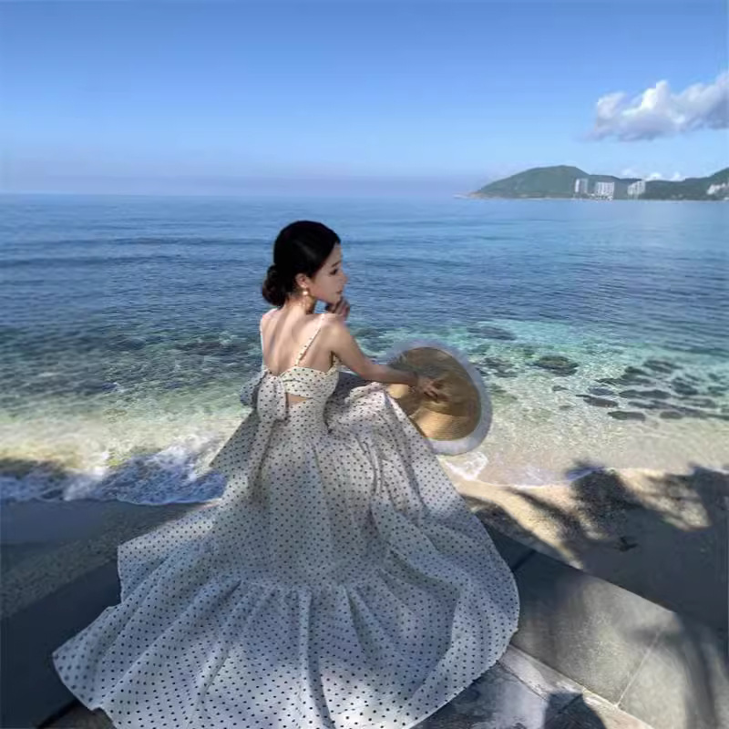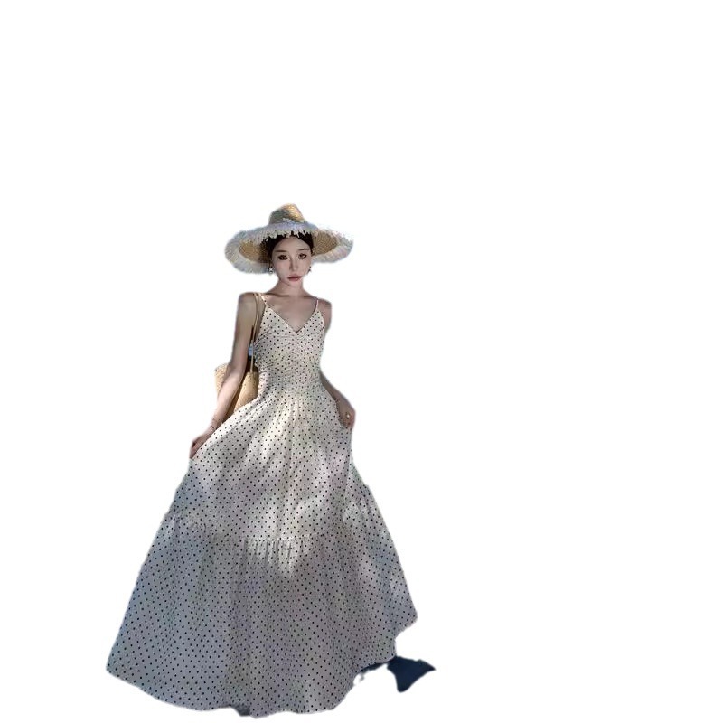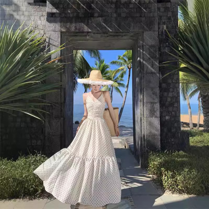 白色波点抹胸吊带裙女夏度假连衣裙法式收腰褶皱长裙V领