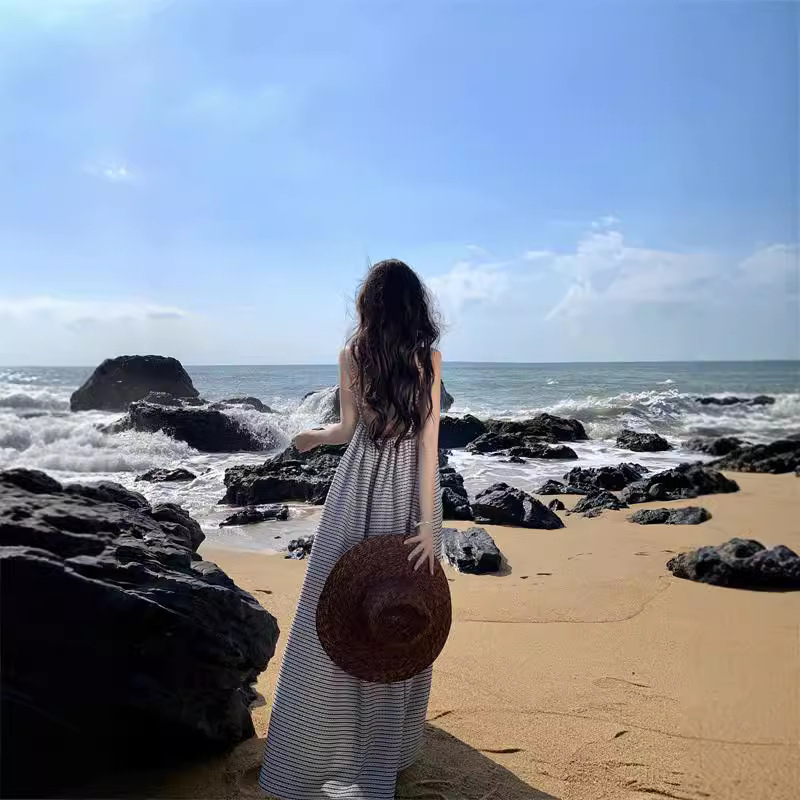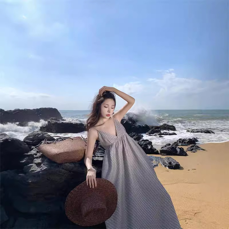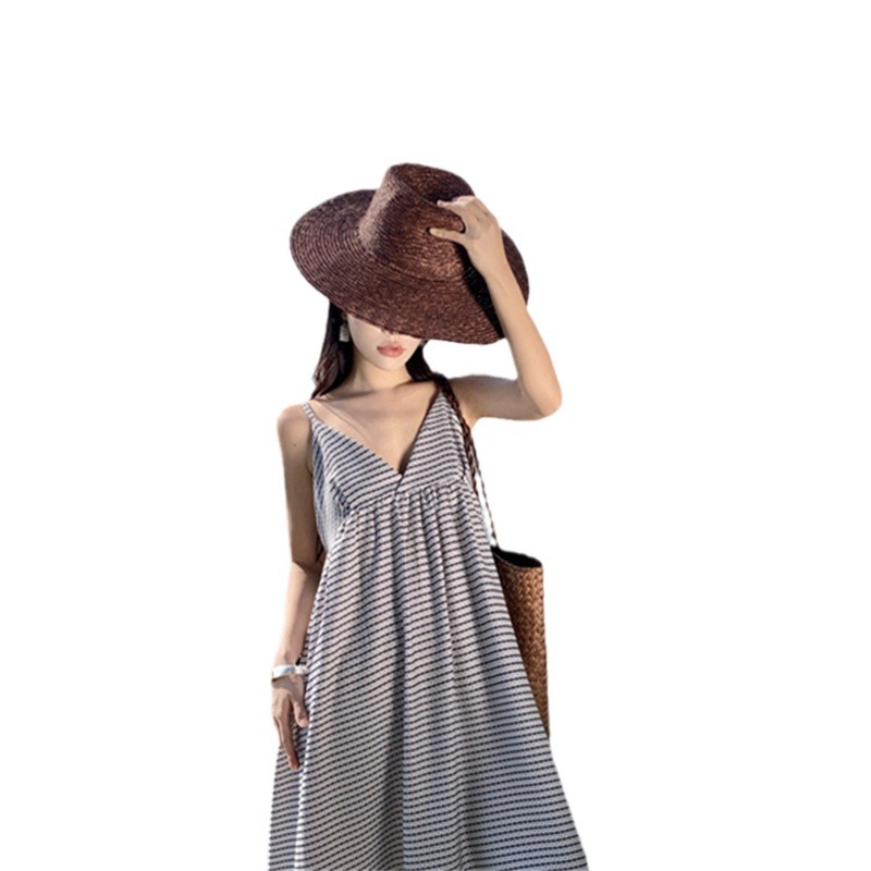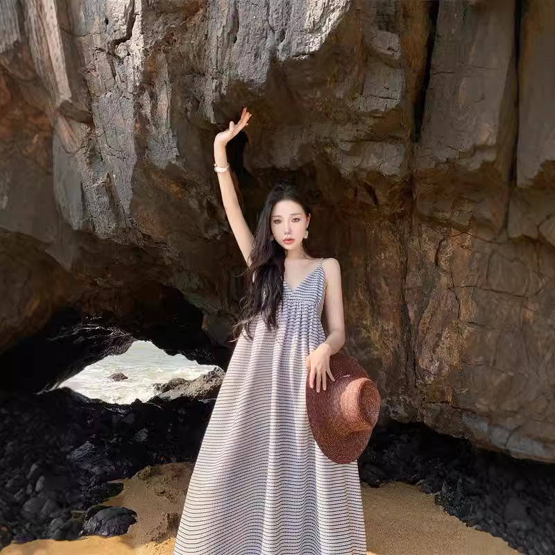 高光旋律 格纹吊带连衣裙女夏季新款宽松露背长裙抹胸裙