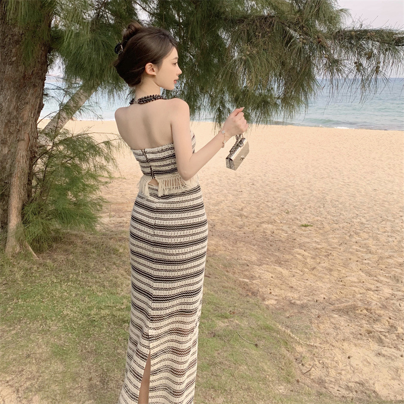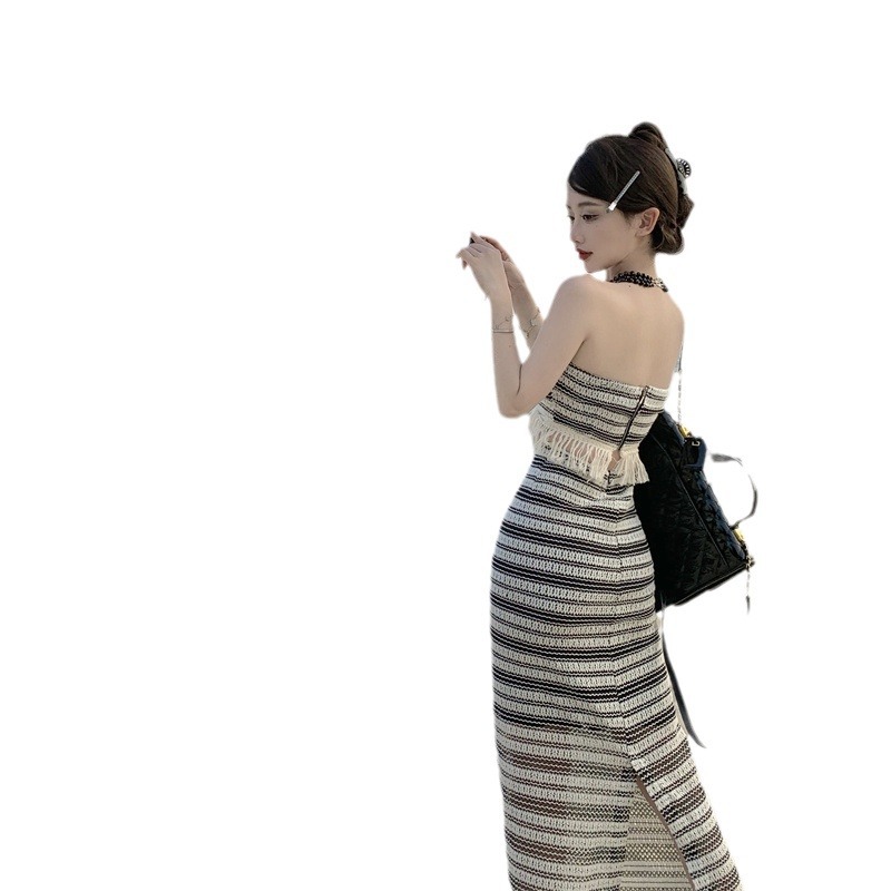 夏季新款法式气质流苏边黑白条纹针织抹胸背心半身裙套装女