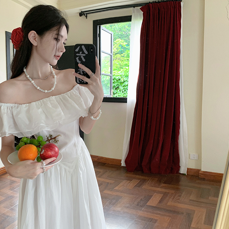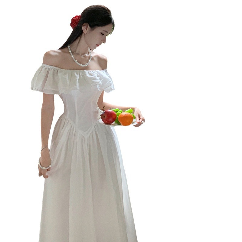 白色气质荷叶边显瘦飞飞袖a字裙连衣裙长裙女夏