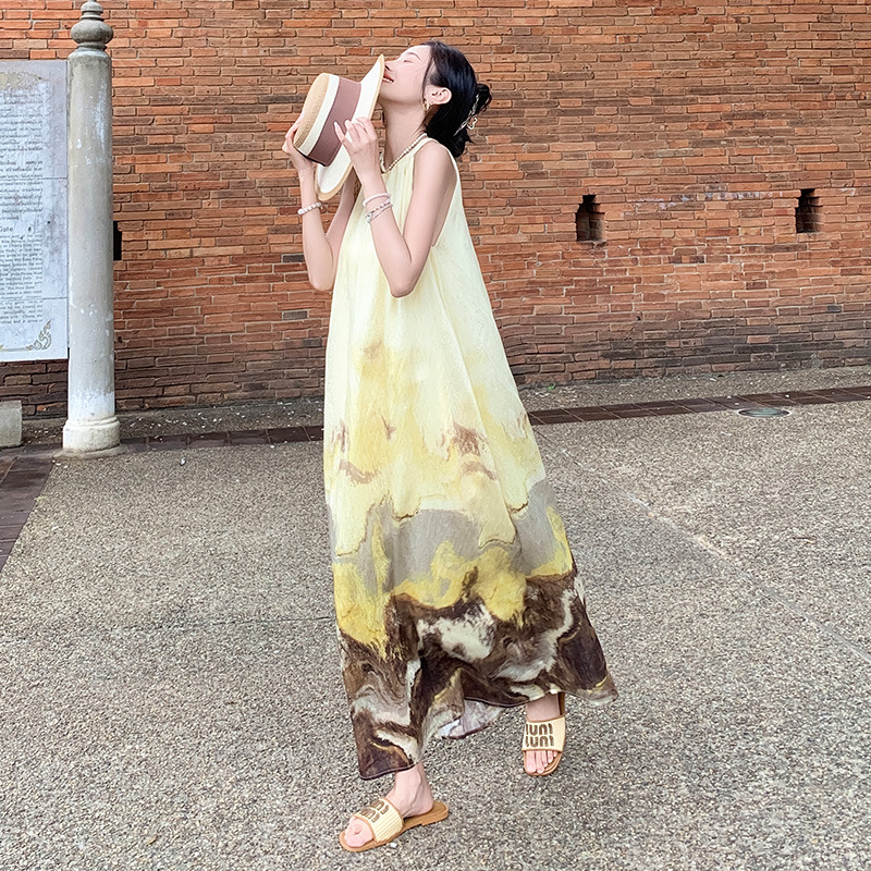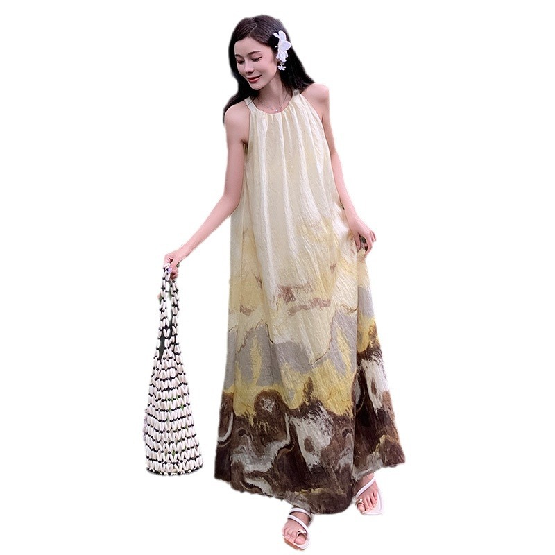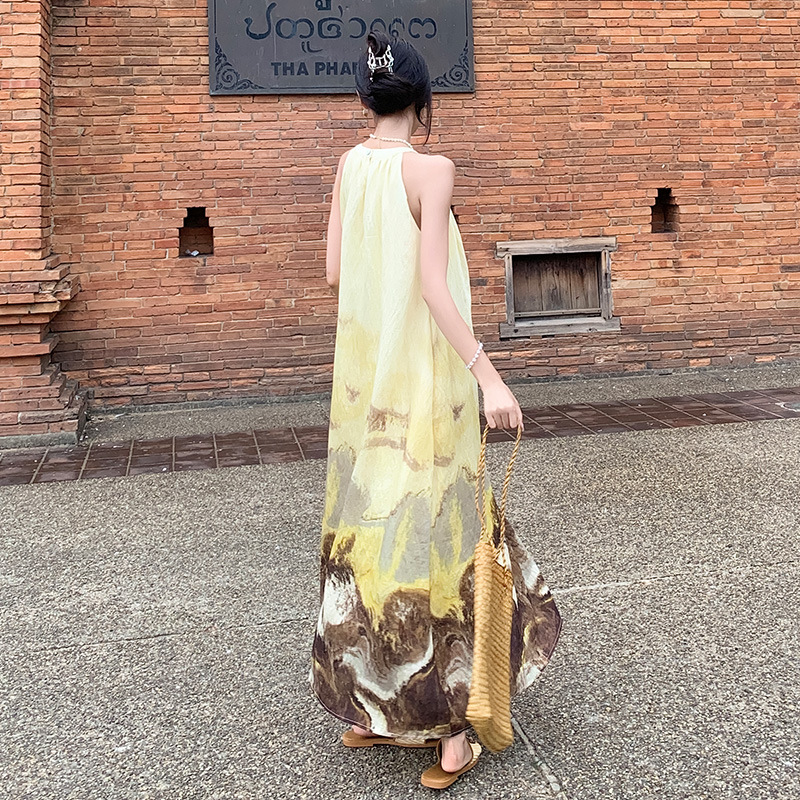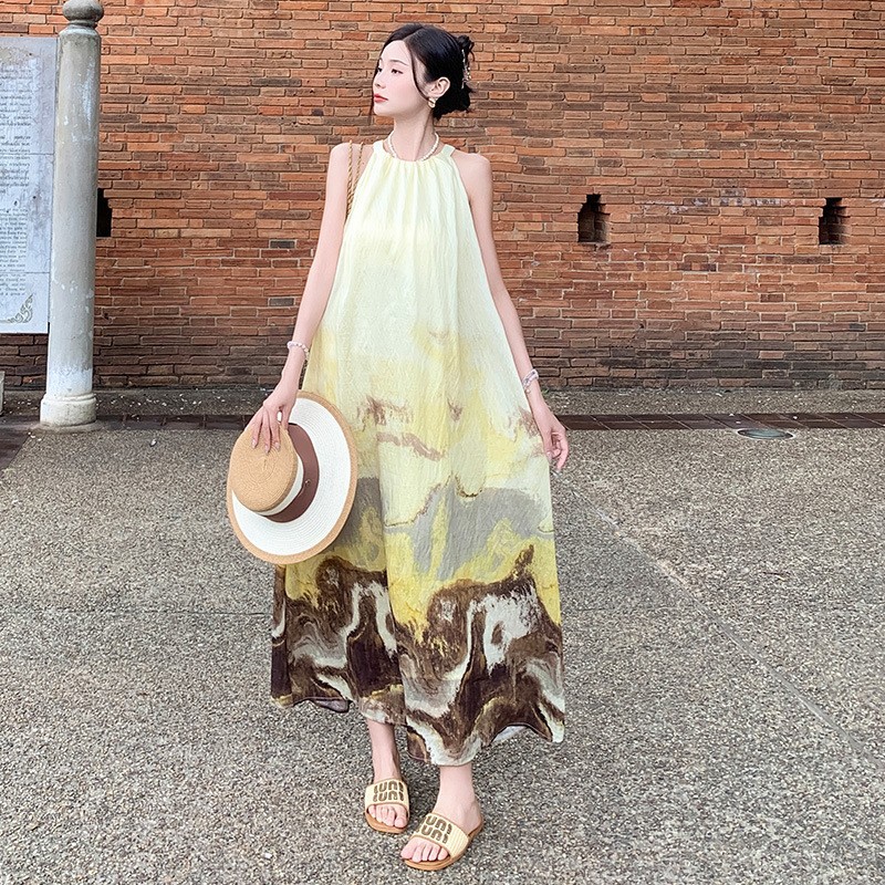古典油画感印花提花挂脖无袖连衣裙女长款a字裙