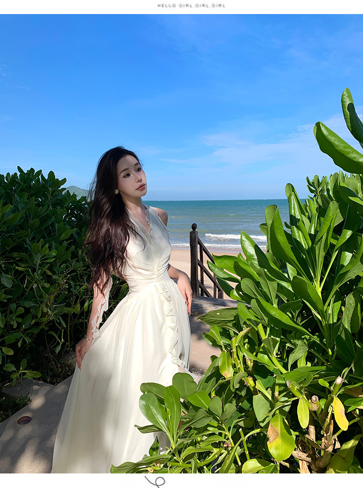 米白色雪纺深V领开叉大裙摆仙裙挂脖吊带连衣裙