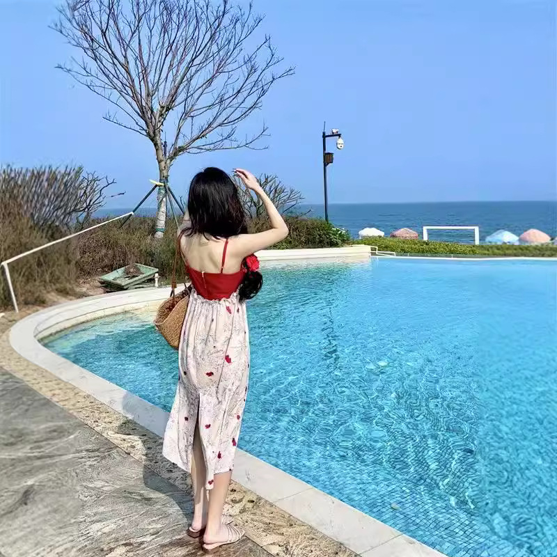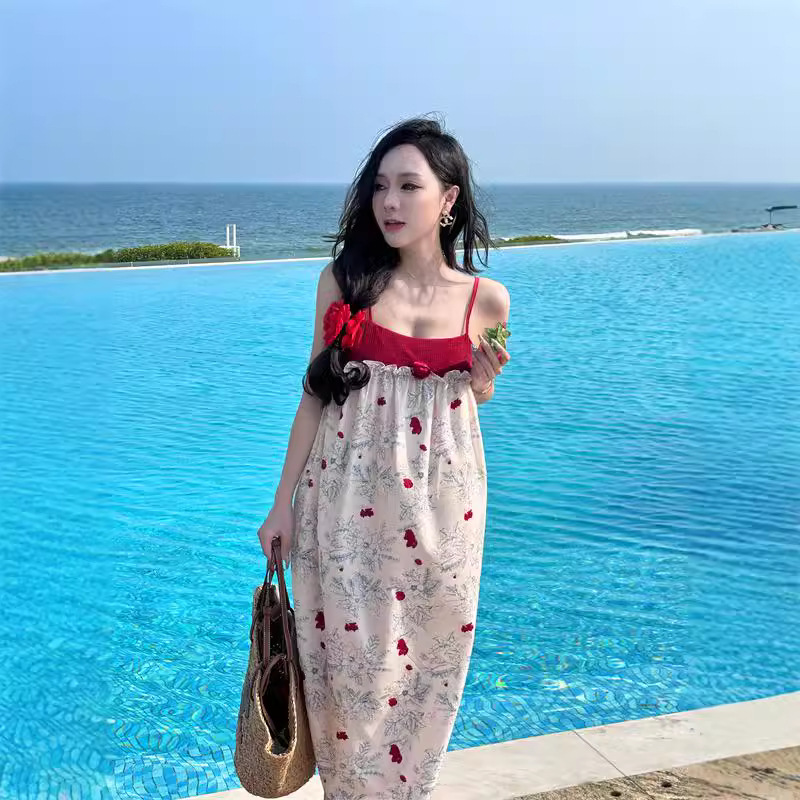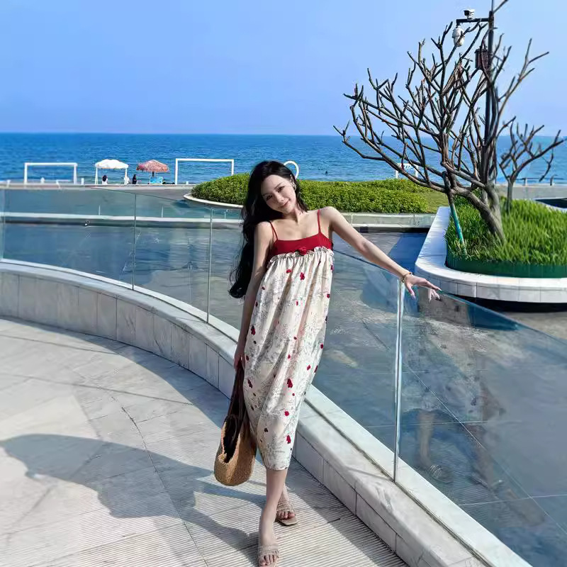拼接撞色慵懒风吊带裙宽松长款连衣裙