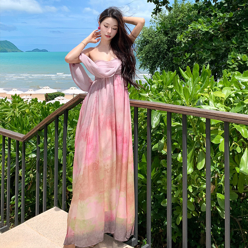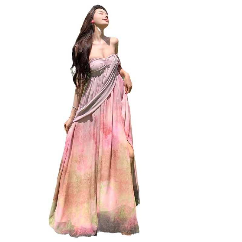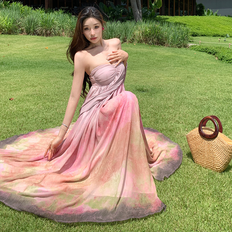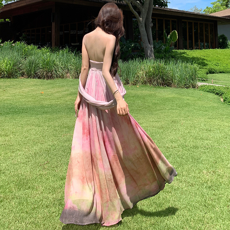 复古油画晕染抹胸度假风长裙气质温柔仙女裙