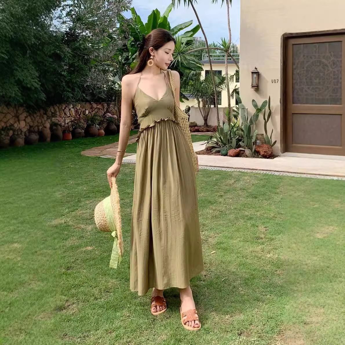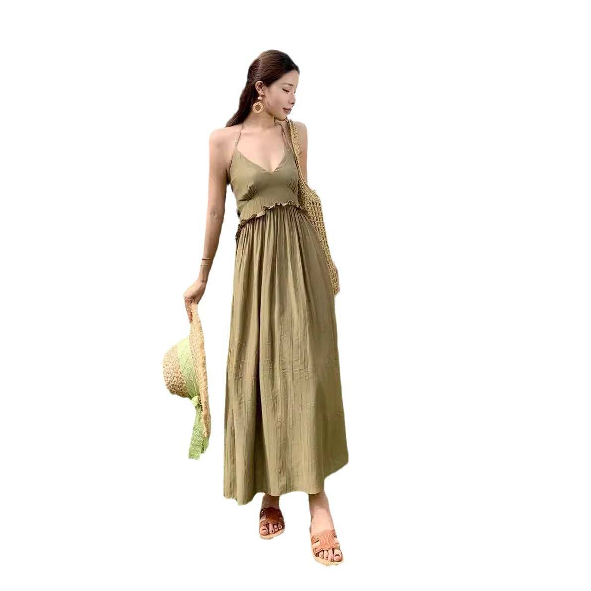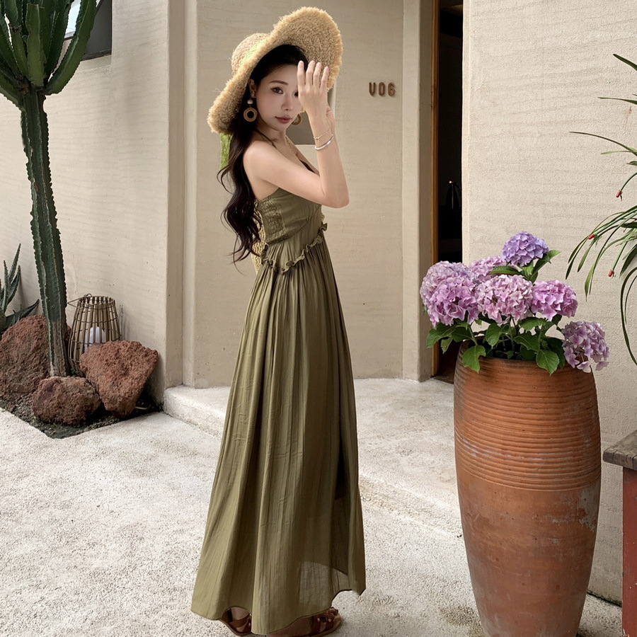 法式复古V领吊带海边度假连衣裙女气质茶歇别致小众收腰显瘦长裙