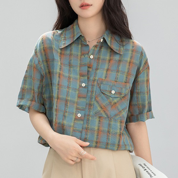 CHAO级推荐~格子条纹短袖衬衫女25新款夏季格纹衬衣