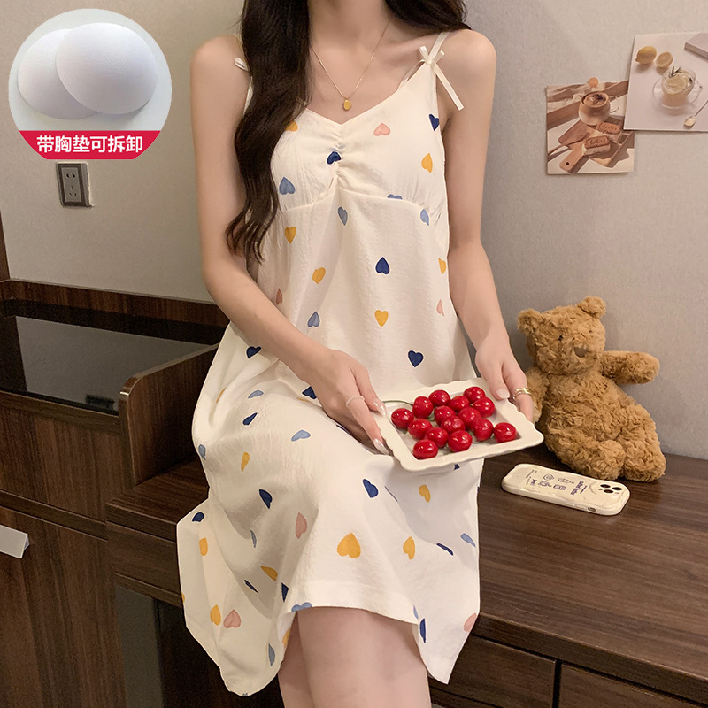 ins韩版彩色爱心甜美带胸垫吊带睡裙女夏季可爱泡泡棉宽松中长款