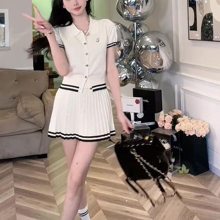 学院风套装女新款夏装针织polo衫短袖上衣高腰百褶短裙两件套