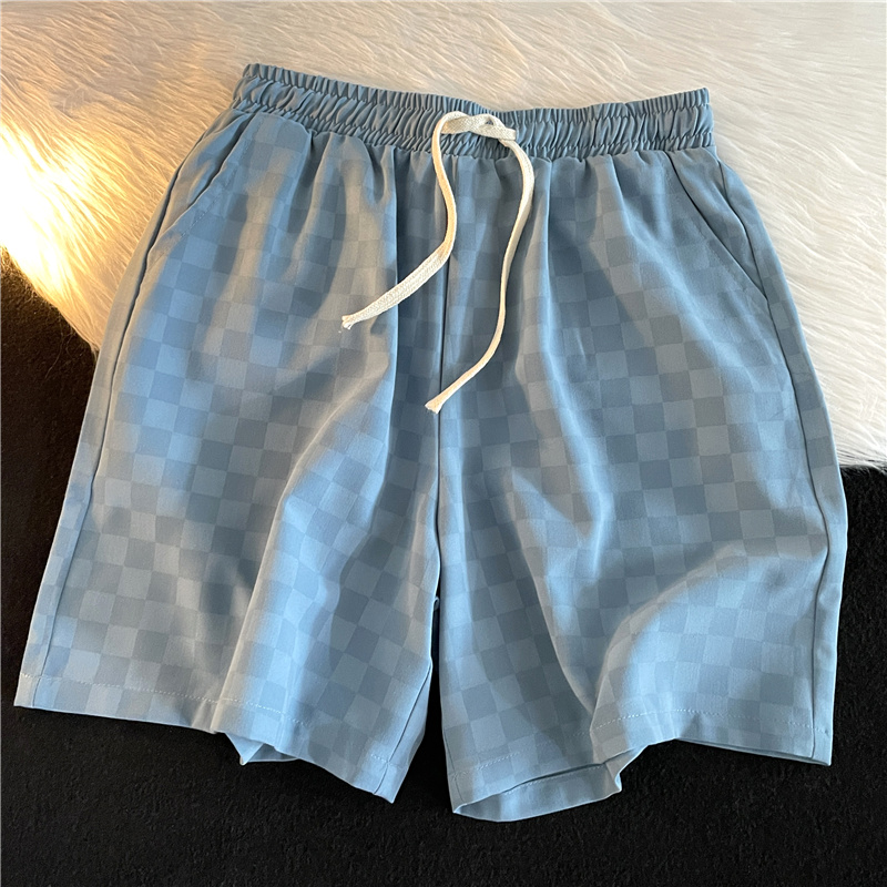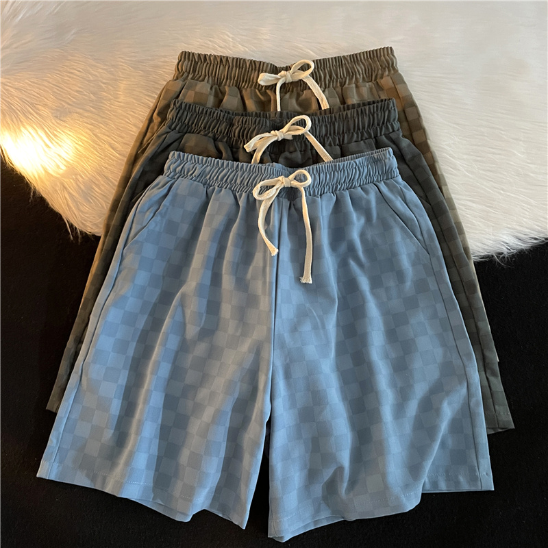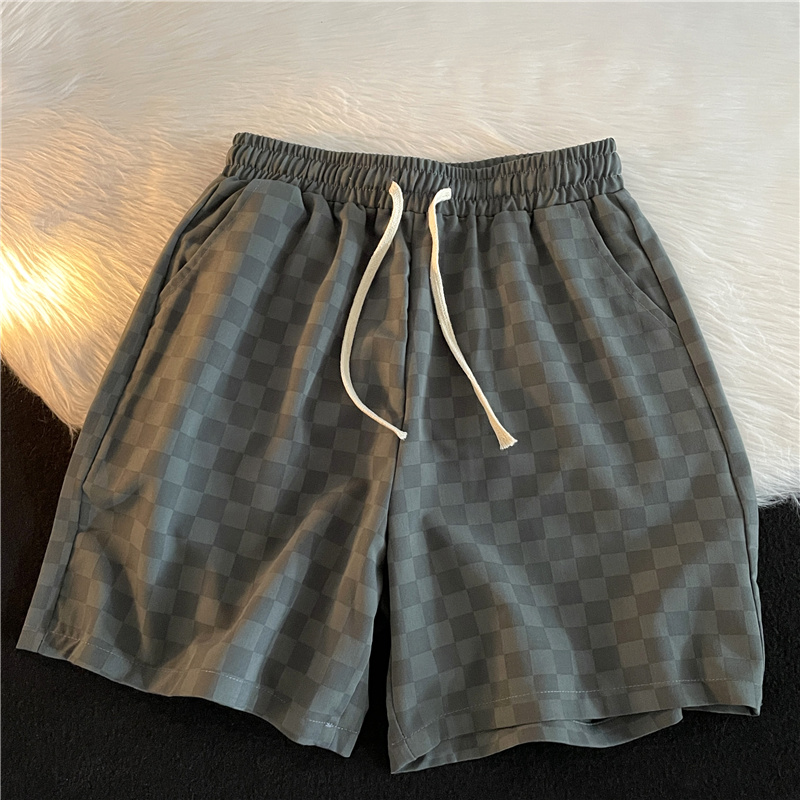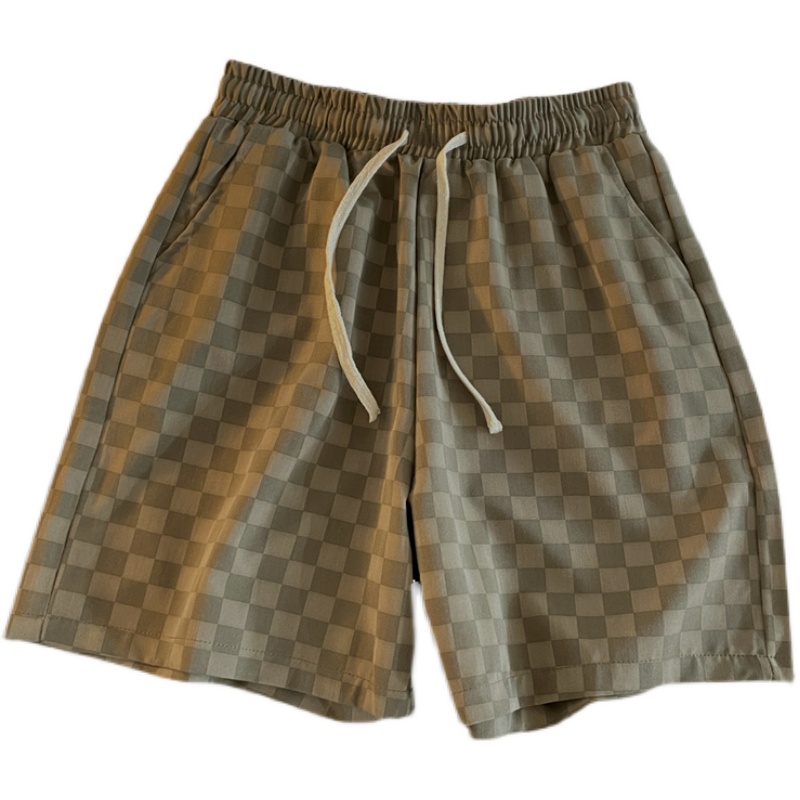 日系复古水洗棋盘格运动短裤男生宽松直筒五分松紧腰抽绳阔腿中裤