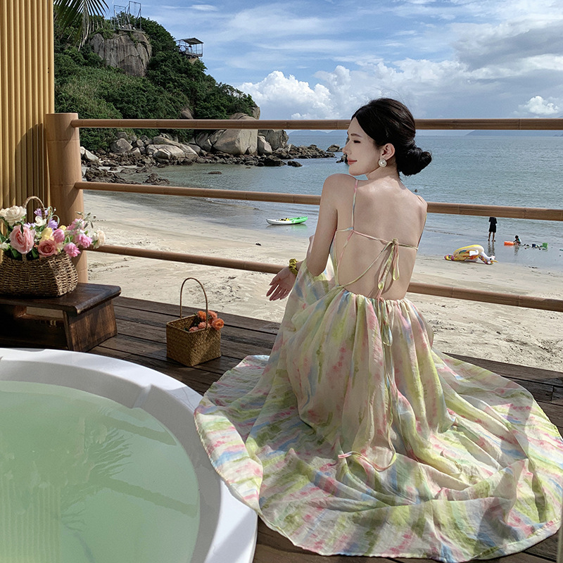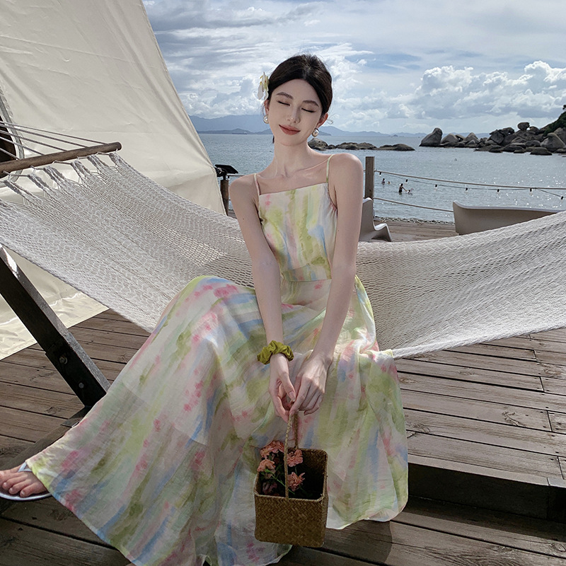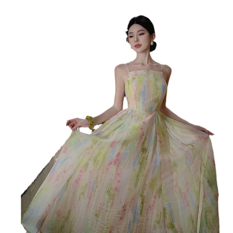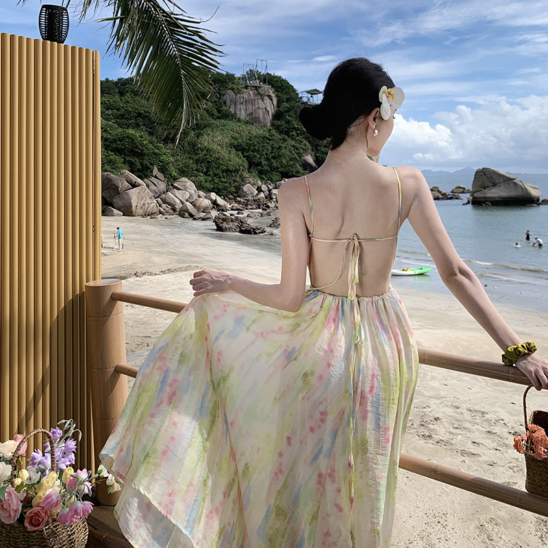 油画中的少女裙露背绑带吊带裙 设计感度假风印花连衣裙