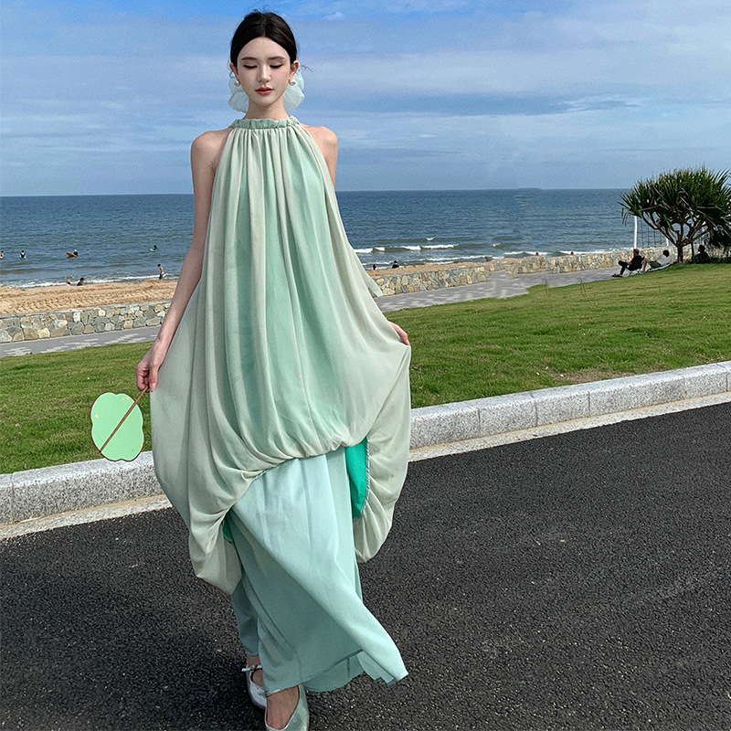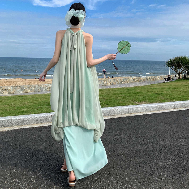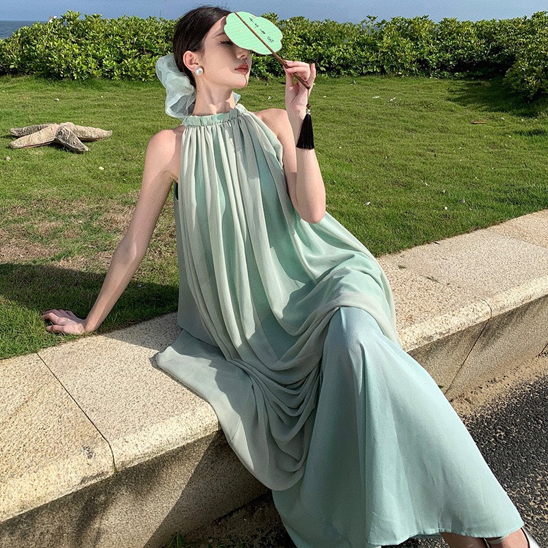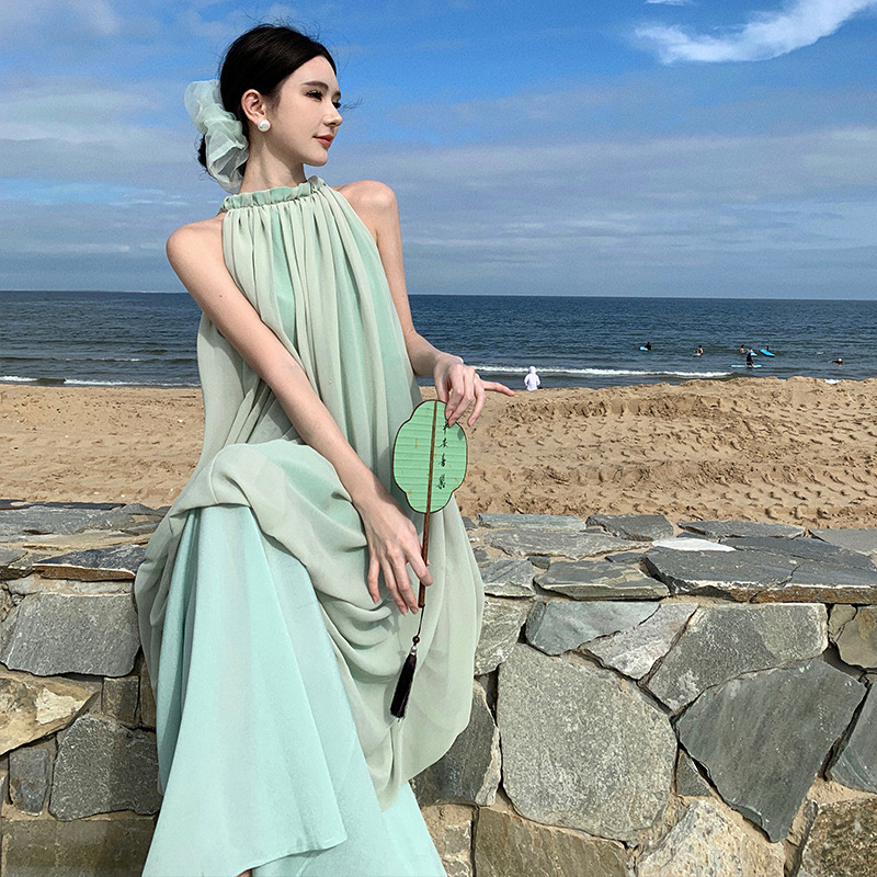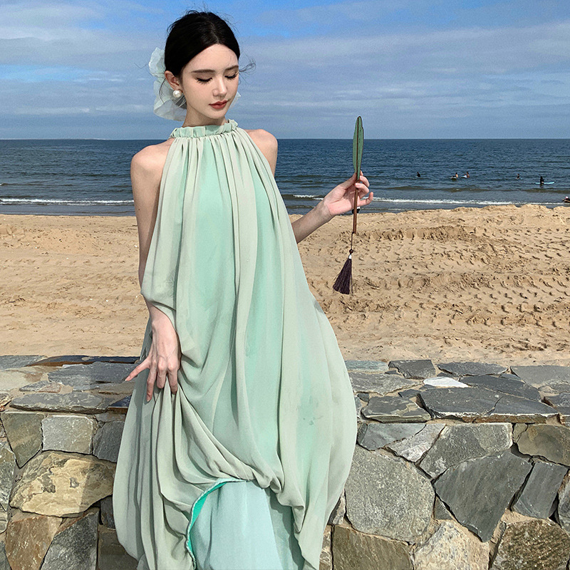 新中式国风无袖挂脖连衣裙高级感气质夏季海边拍照绝美度假长裙子