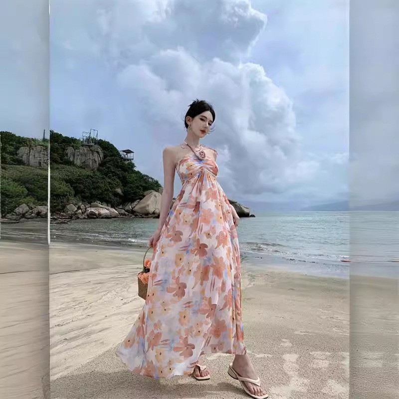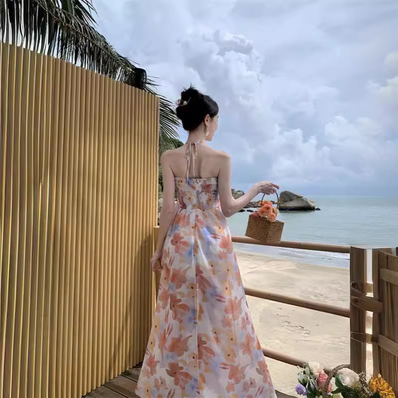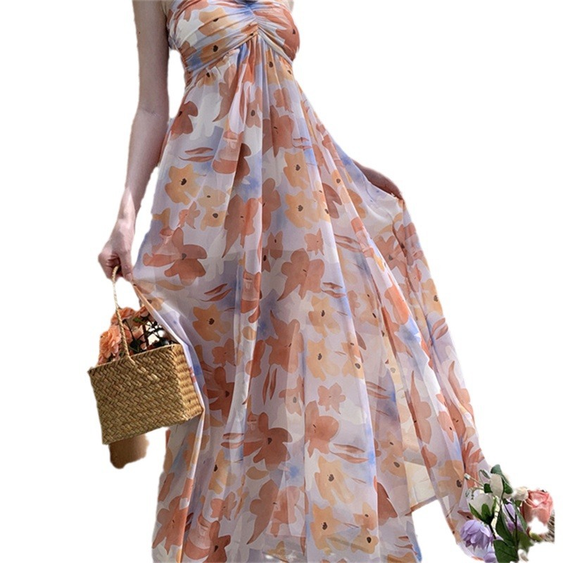 春夏新款女士名媛时尚印花抹胸褶皱A摆长款连衣裙