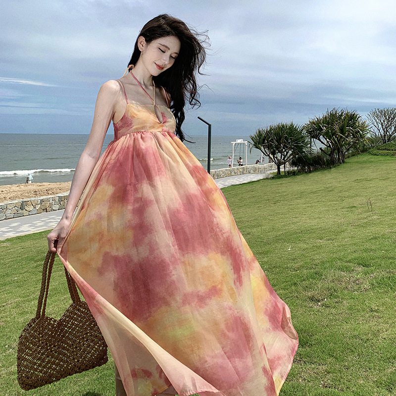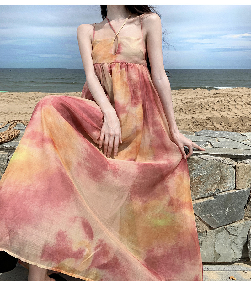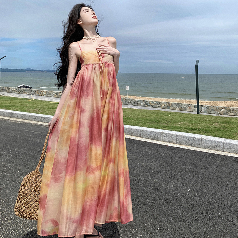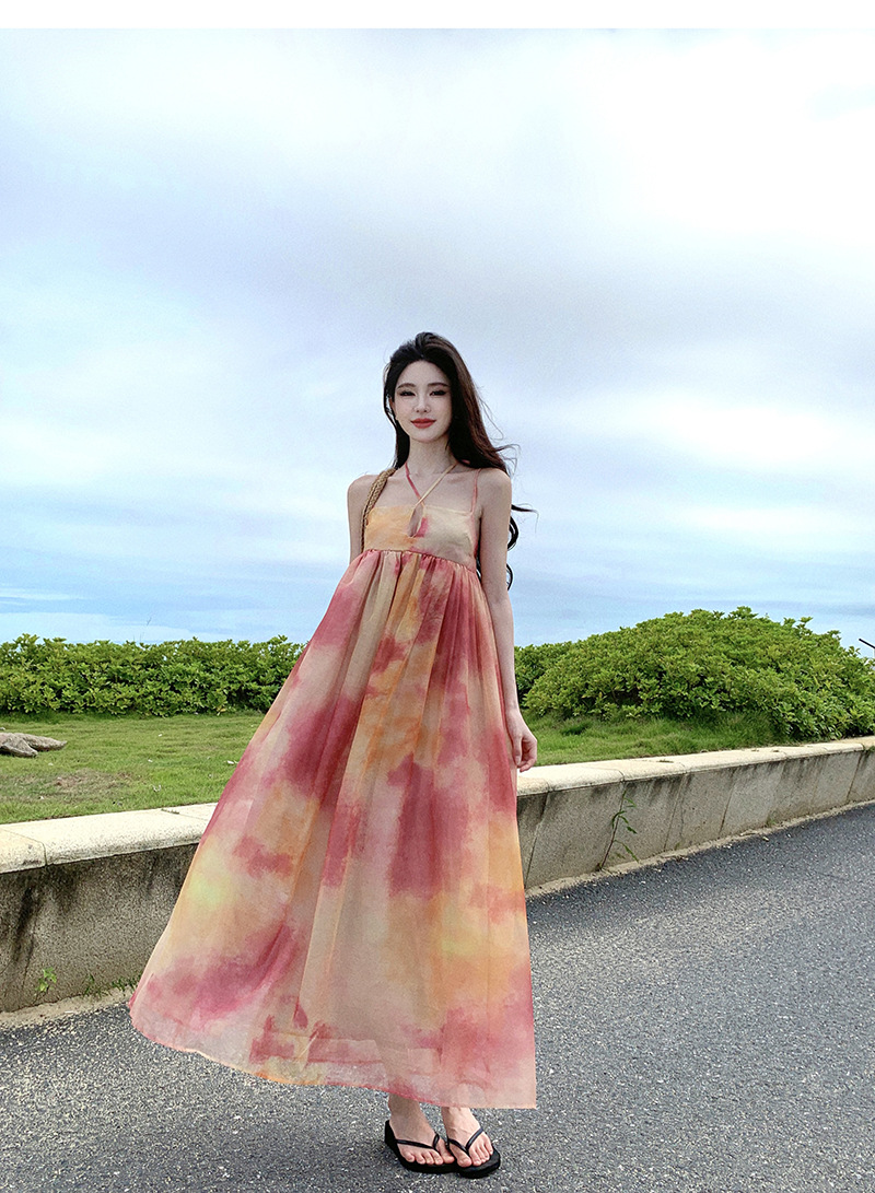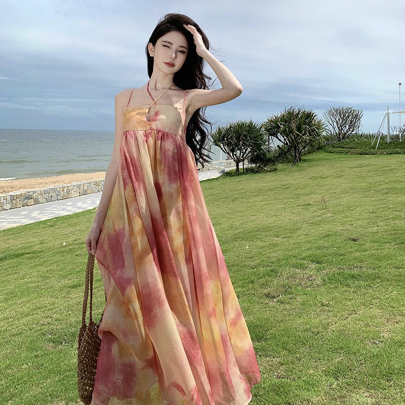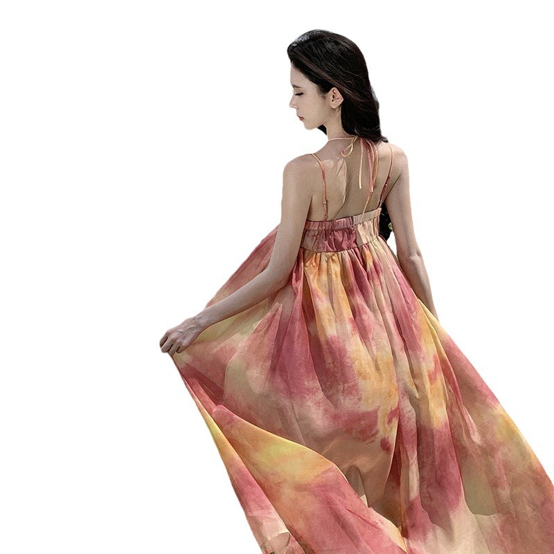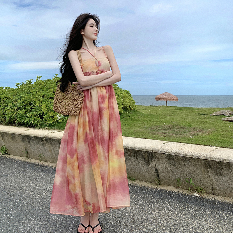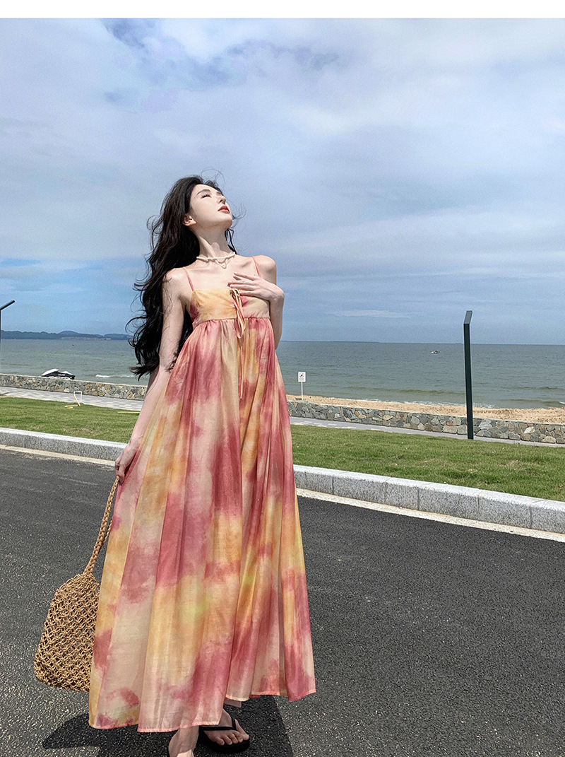 新中式国风晕染海边度假宽松吊带连衣裙温柔风长裙