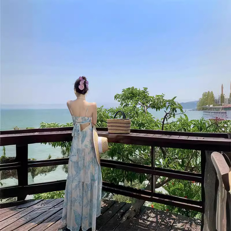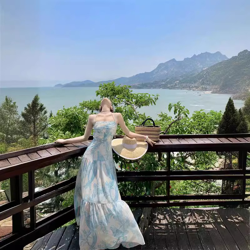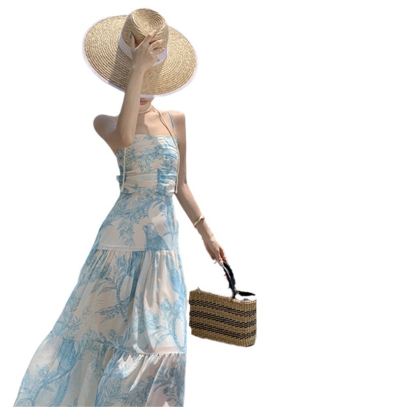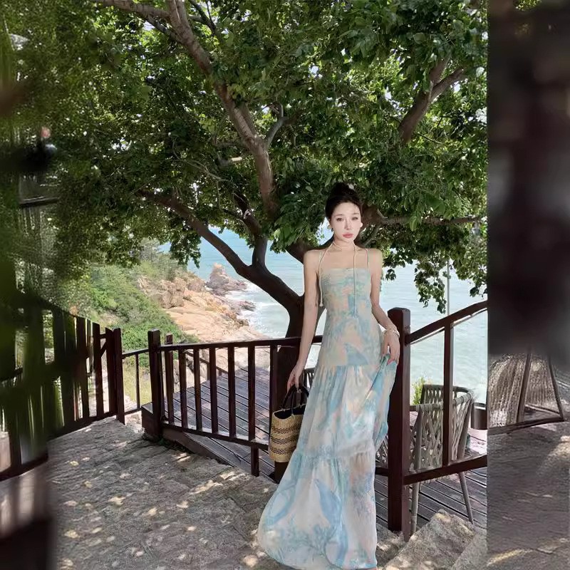 实拍法式超仙女吊带挂脖压褶两件套装裙子女夏季海边度假连衣裙