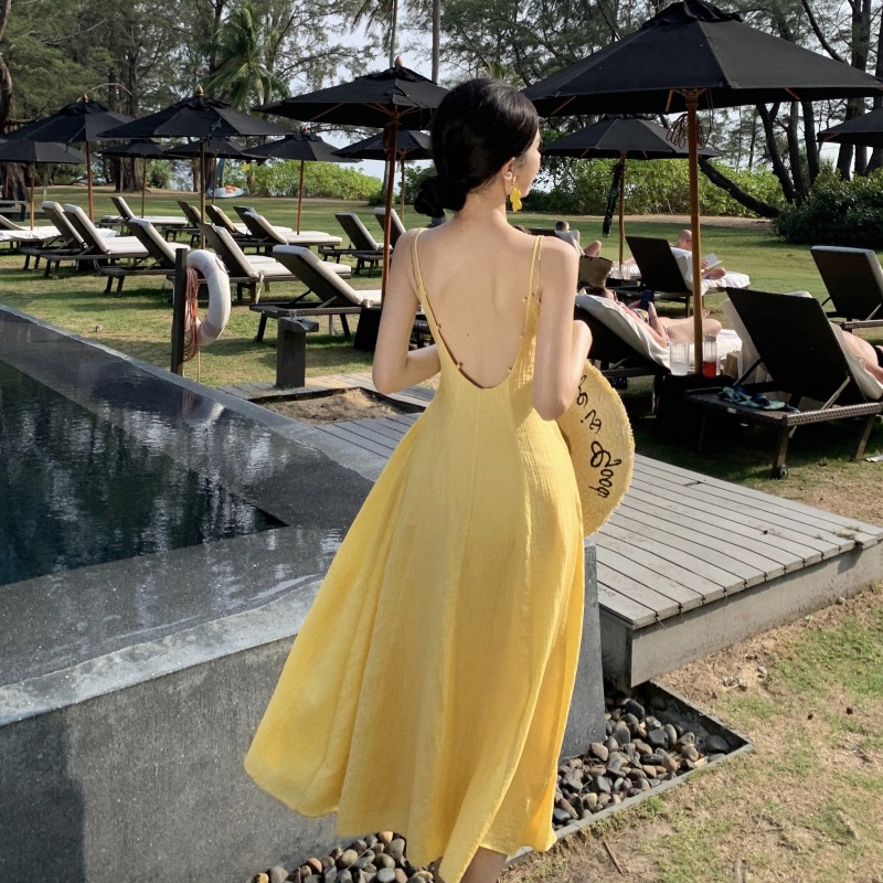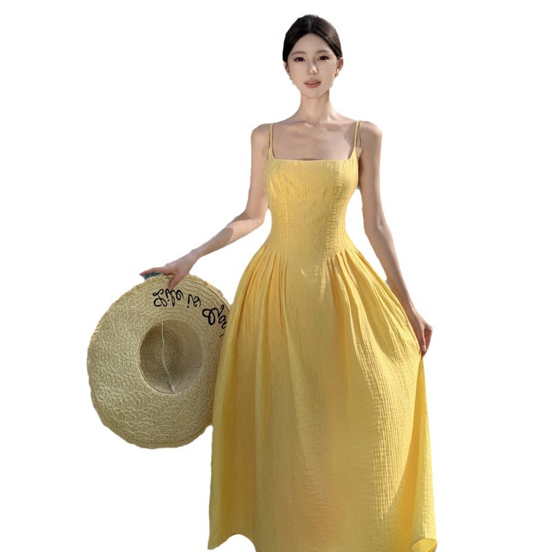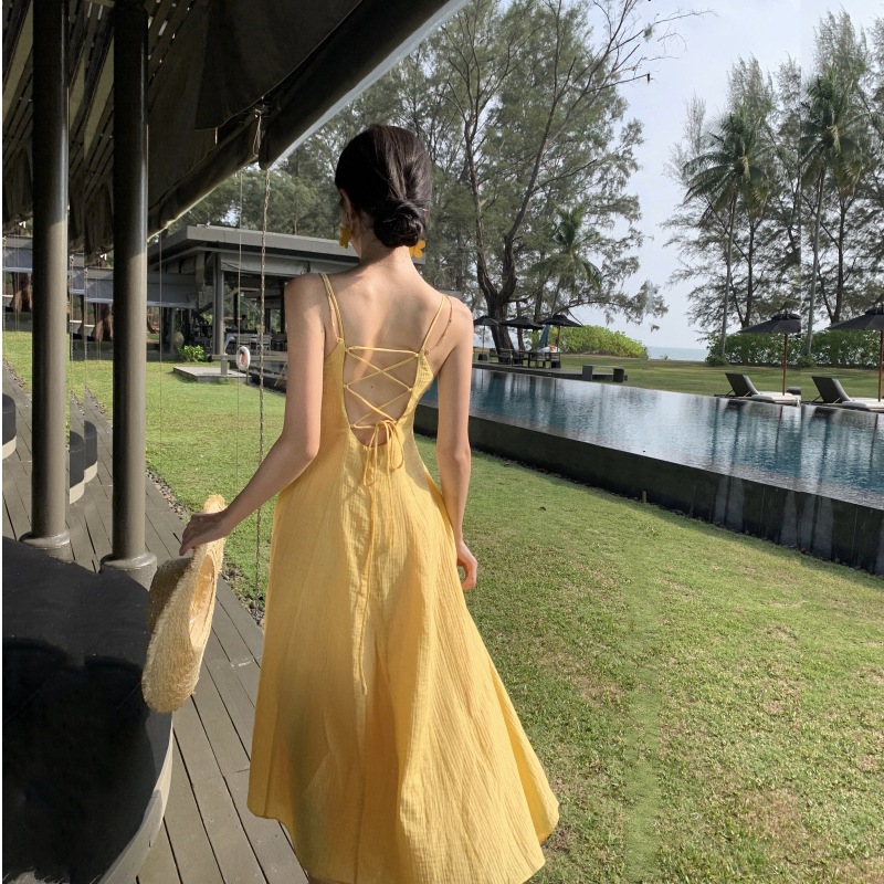 法式露背性感黄色吊带连衣裙夏季新款吊带裙收腰长裙度假裙子