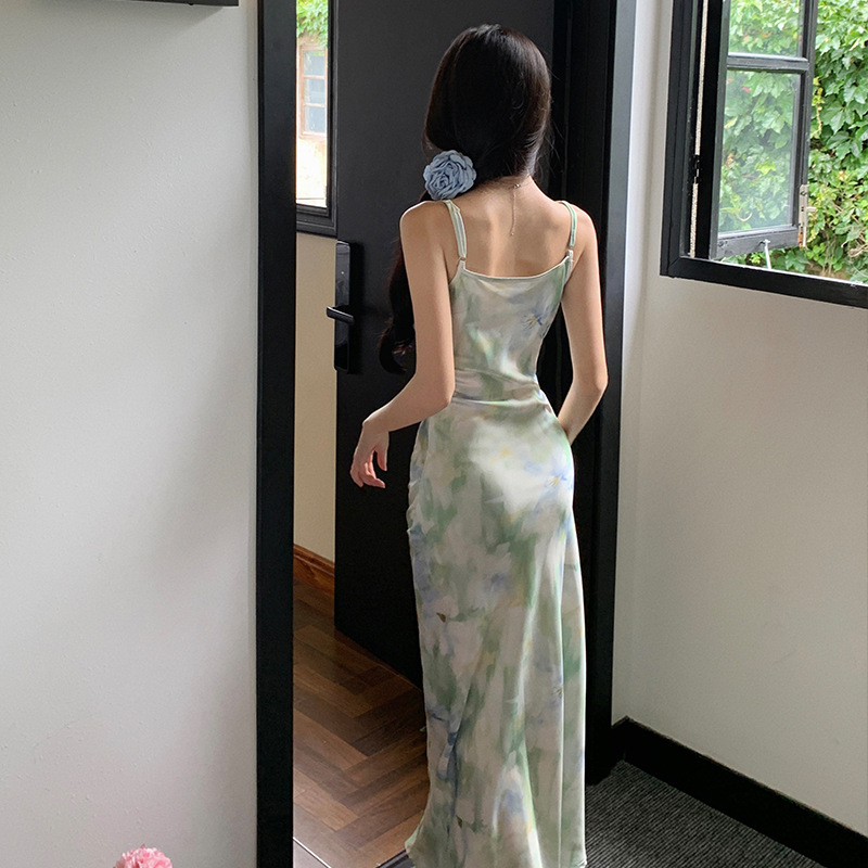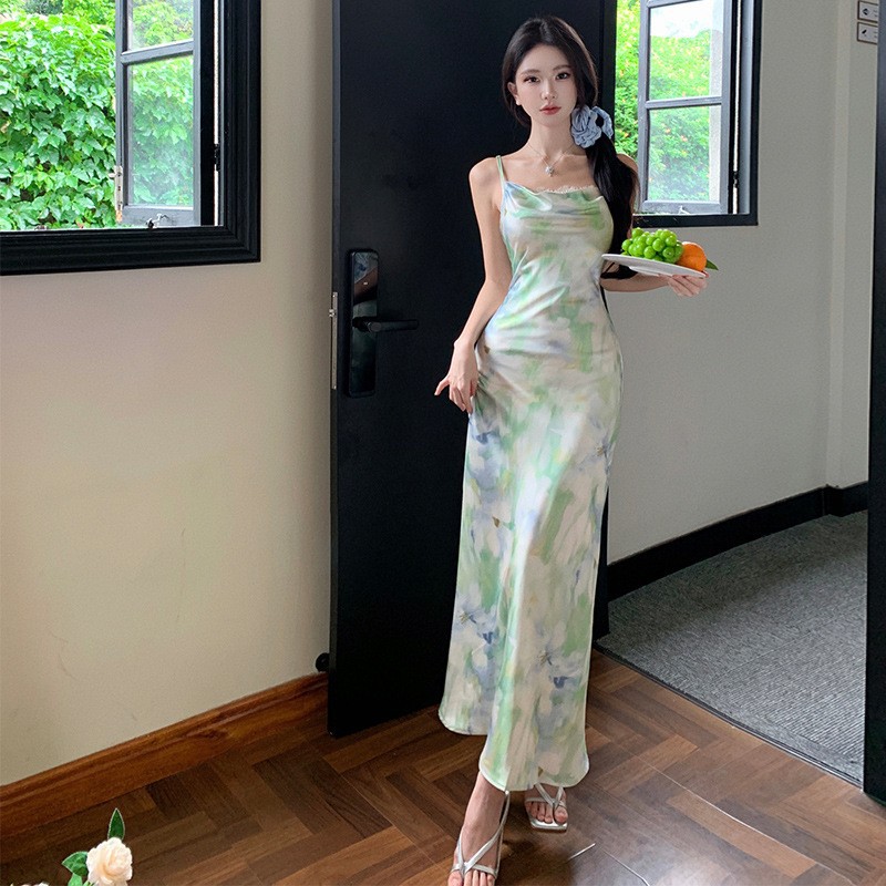 醋酸缎面吊带裙女夏气质温柔风油画长裙法式收腰碎花连衣裙