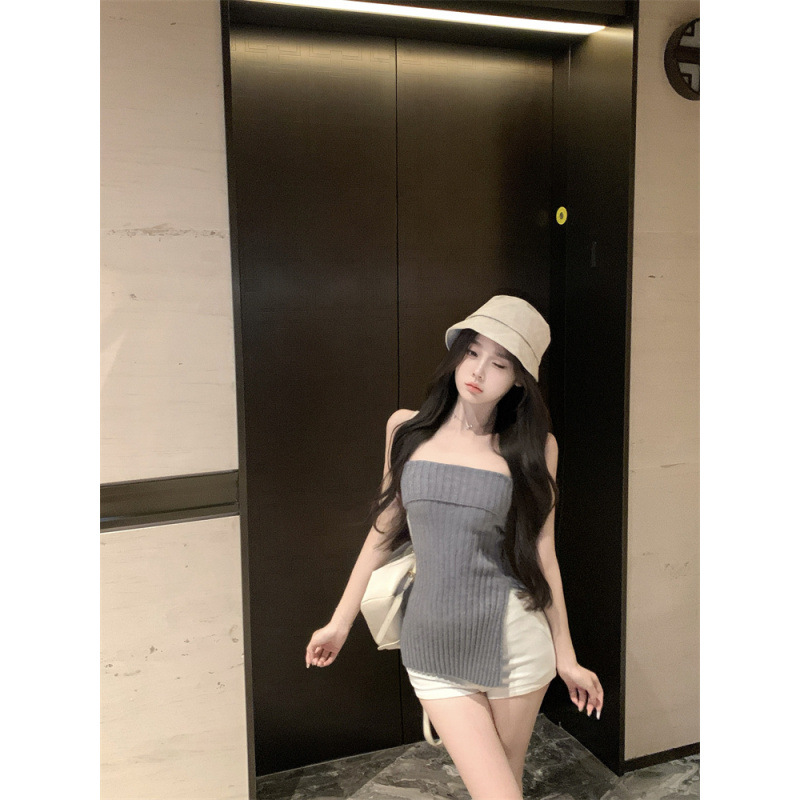 纯欲性感针织抹胸弹力修身灰色坑条设计感上衣