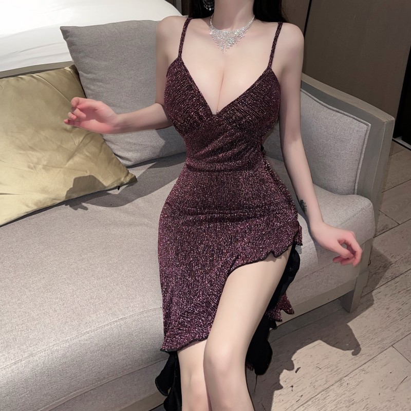 性感吊带亮丝修身显瘦开叉不规则荷叶边连衣裙女