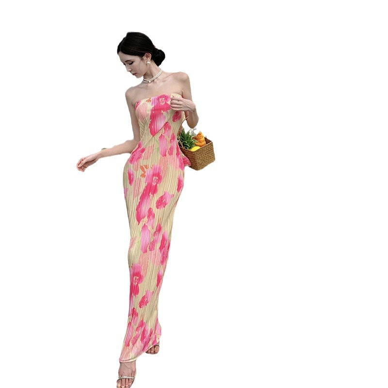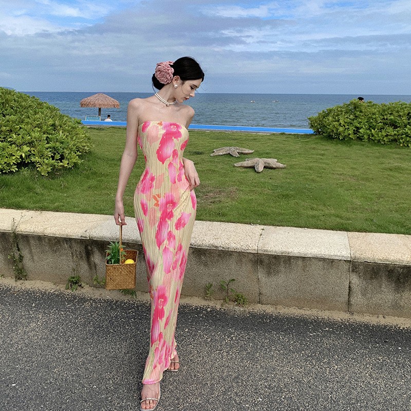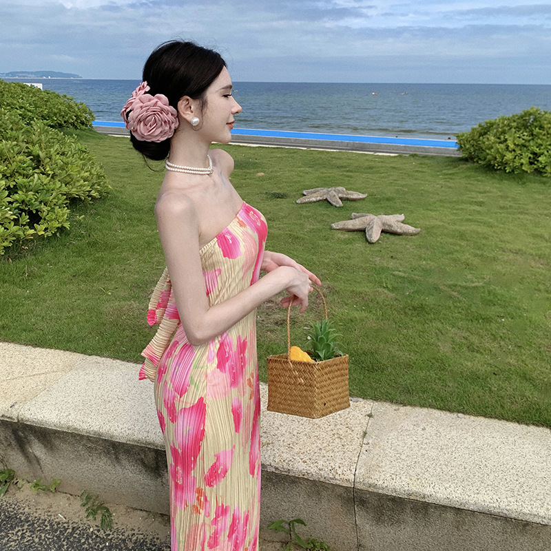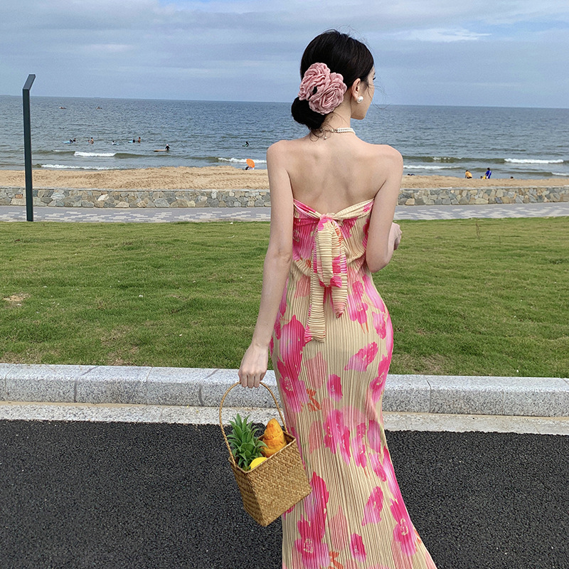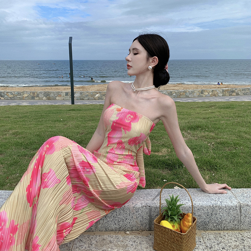 印花抹胸褶皱显瘦度假性感纯欲系带连衣长裙
