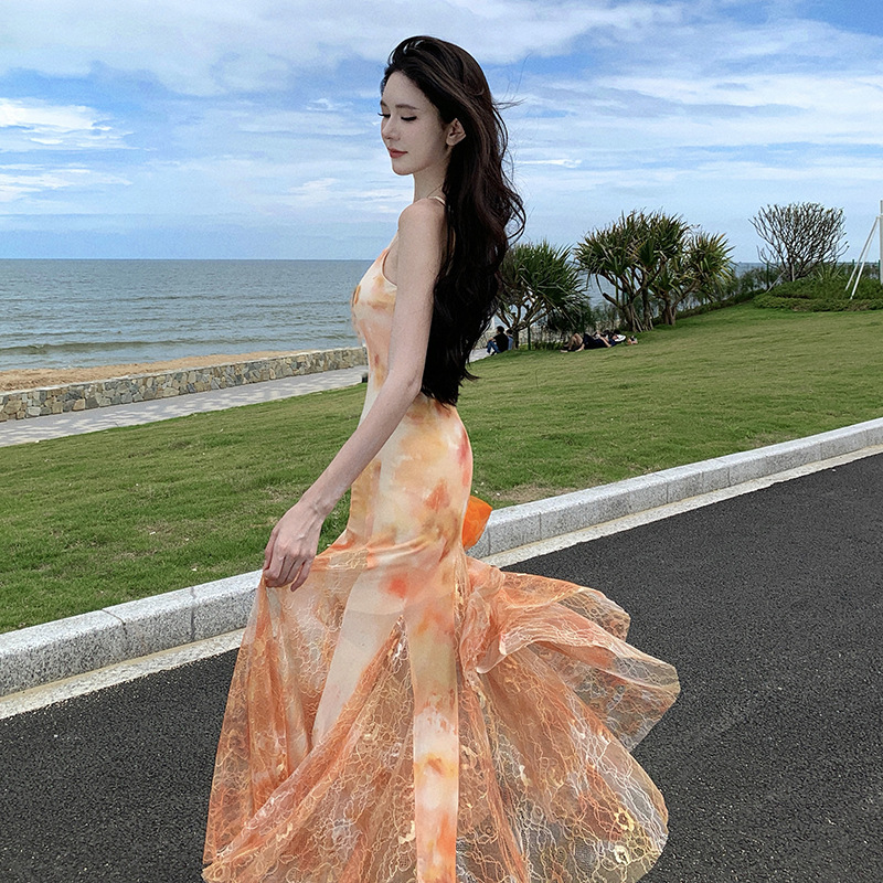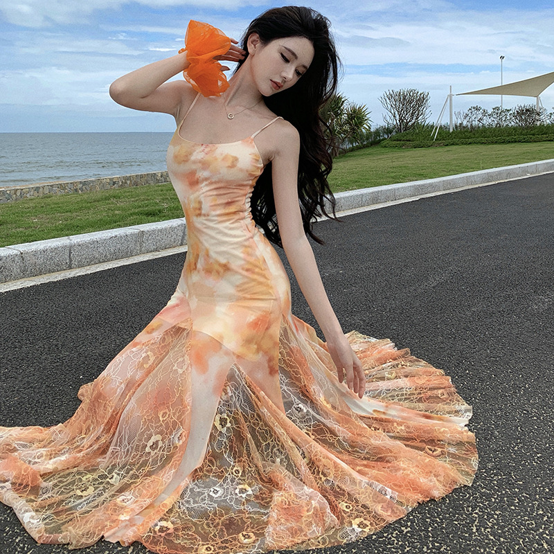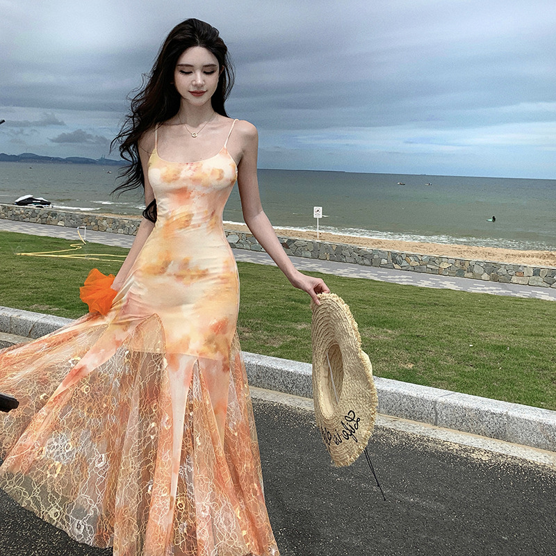 收腰重工鱼尾吊带裙女夏设计感蕾丝小众连衣裙