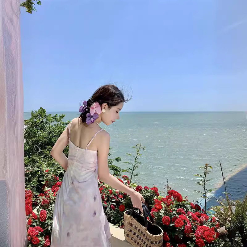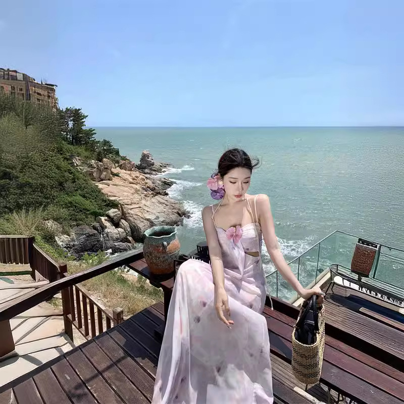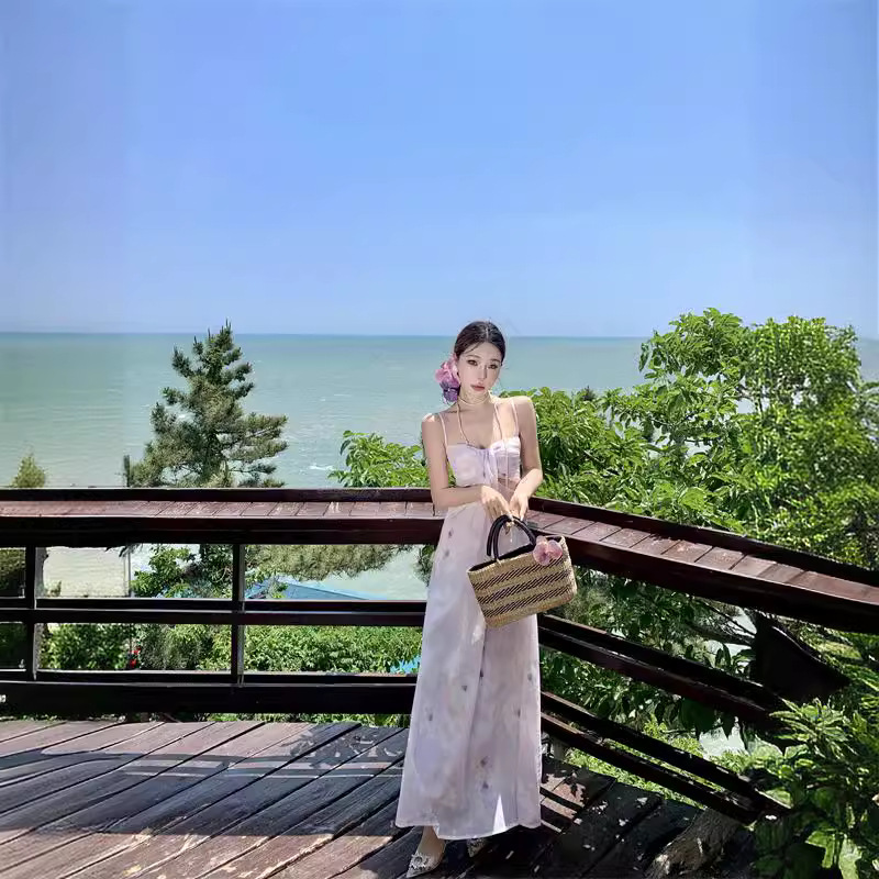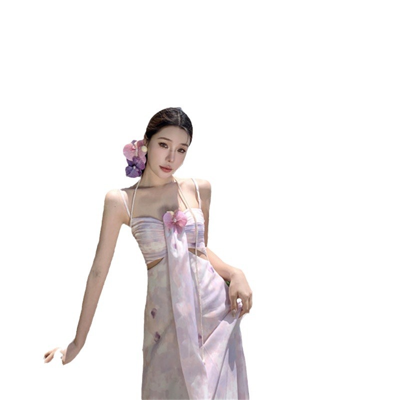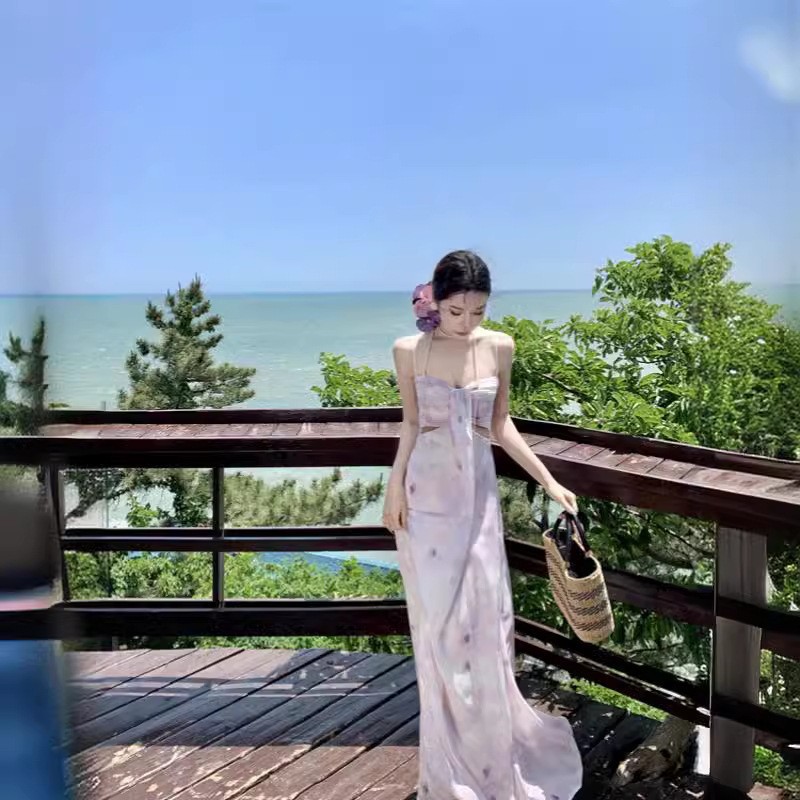 蝴蝶兰镂空压褶紫色吊带连衣裙女夏新款长裙