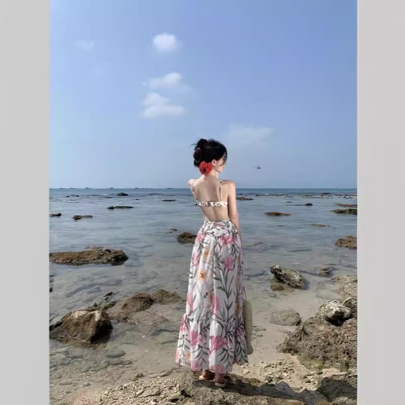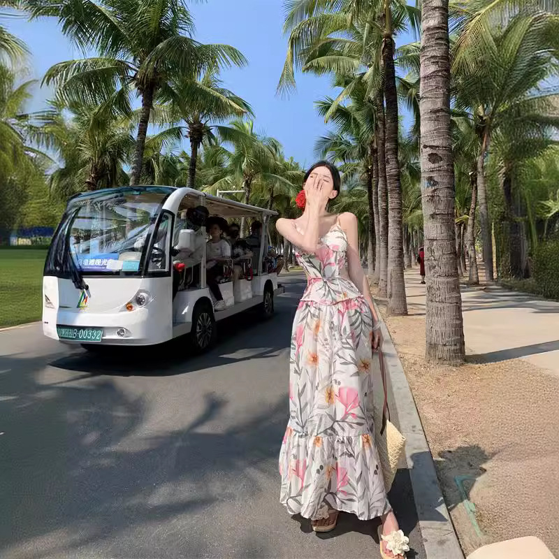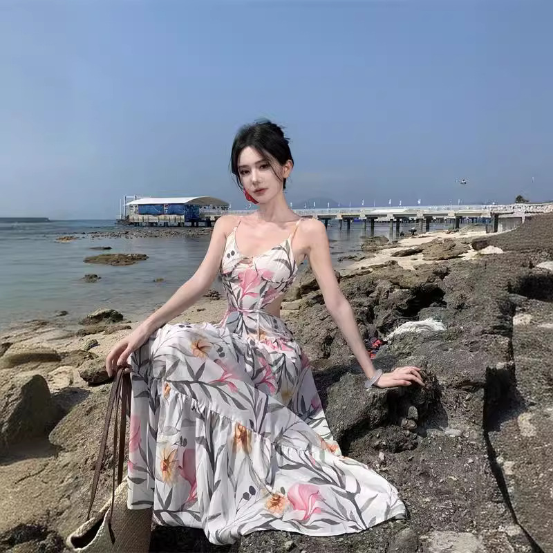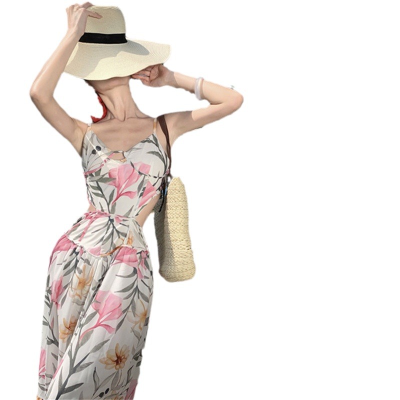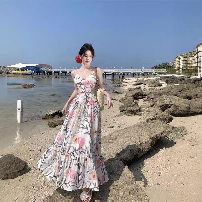 法式浪漫印花吊带连衣裙夏季新款气质女神收腰显瘦V领度假长裙