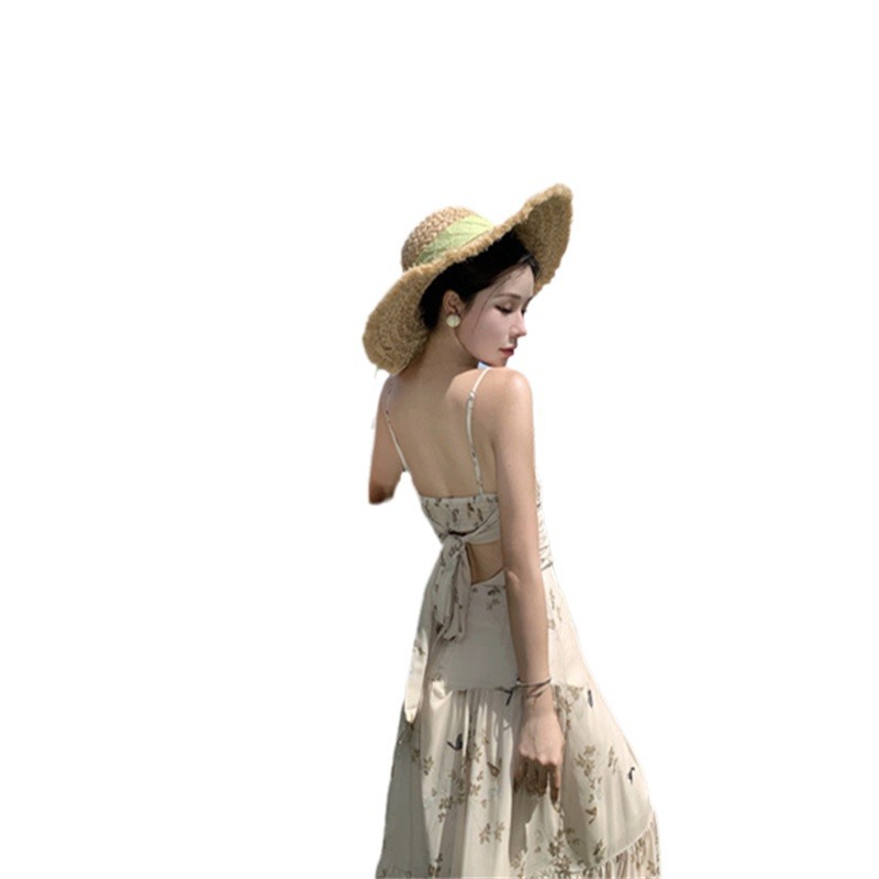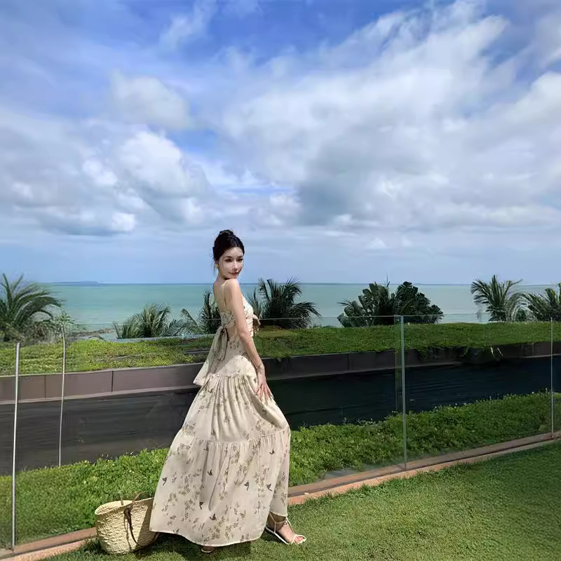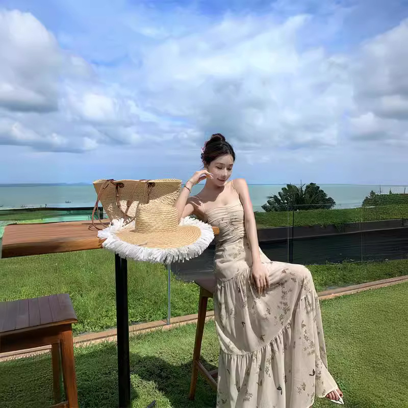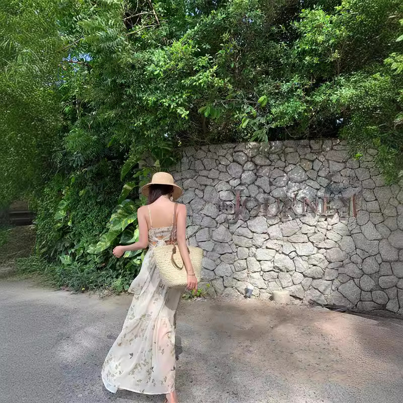 秋叶海棠法式长裙风情万种的黄色碎花吊带连衣裙夏
