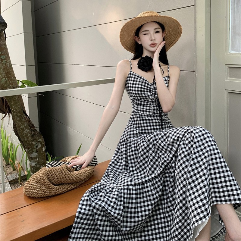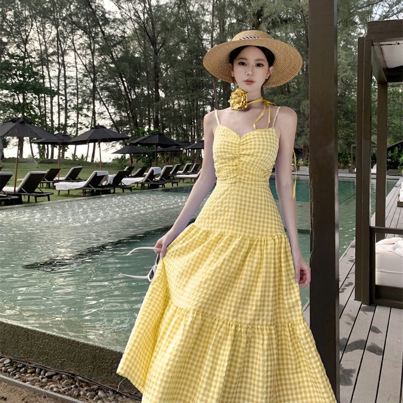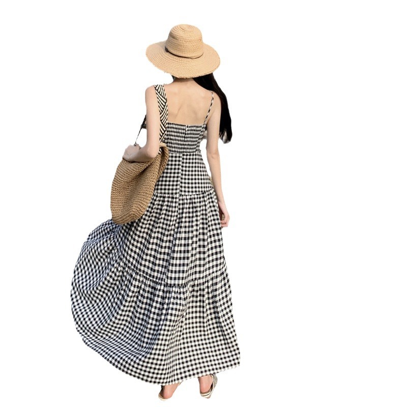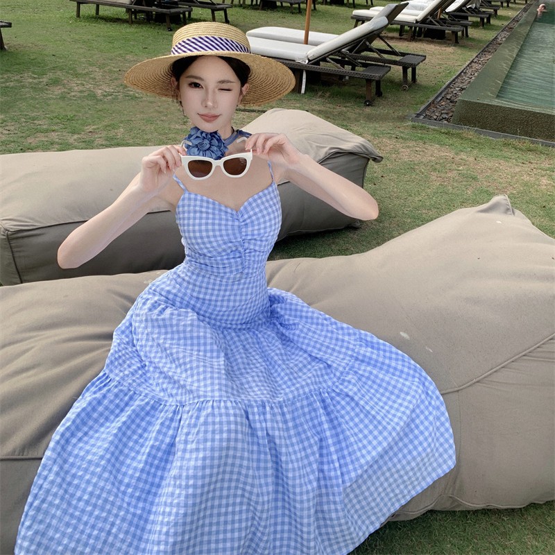 茶歇法式初恋气质甜美格子吊带连衣裙海边度假沙滩长裙有领花