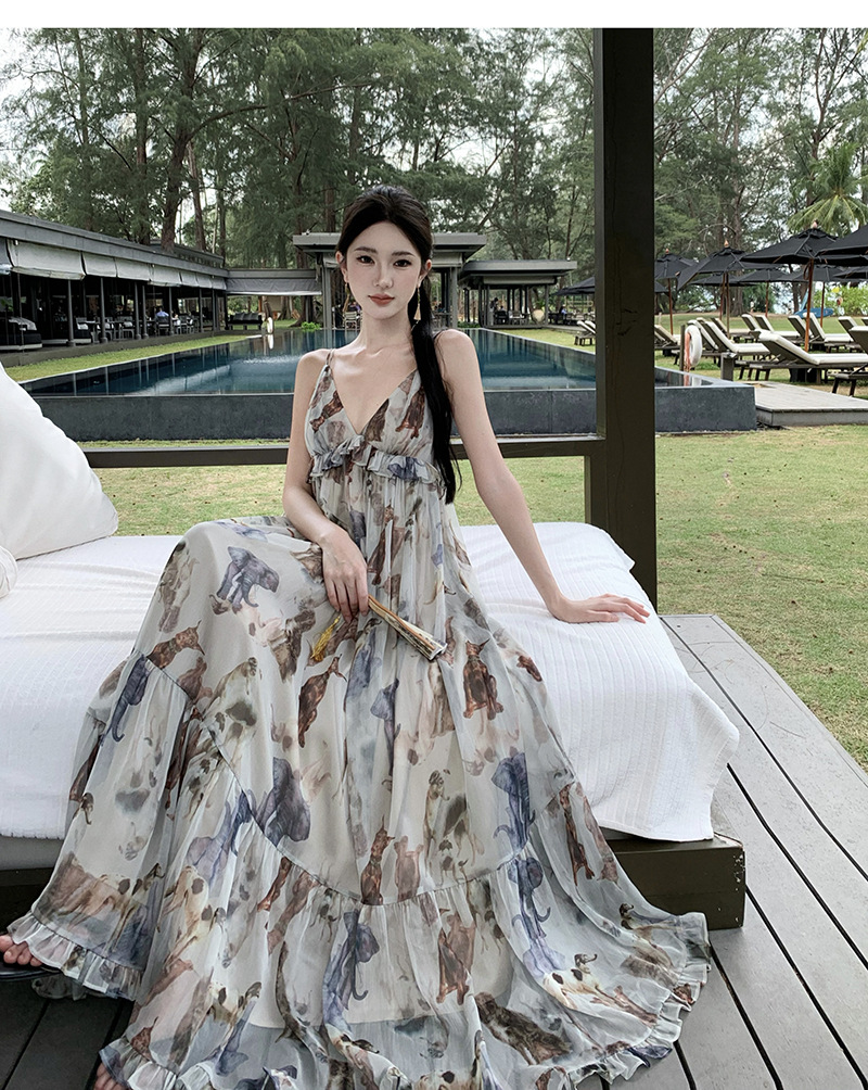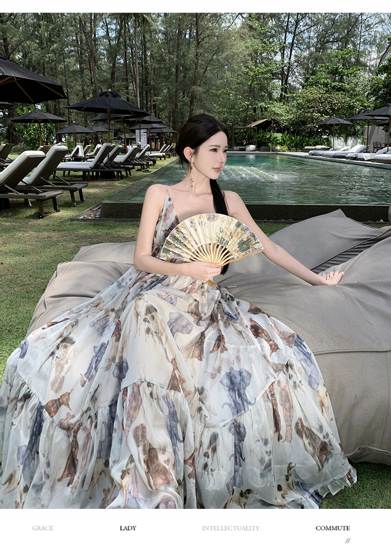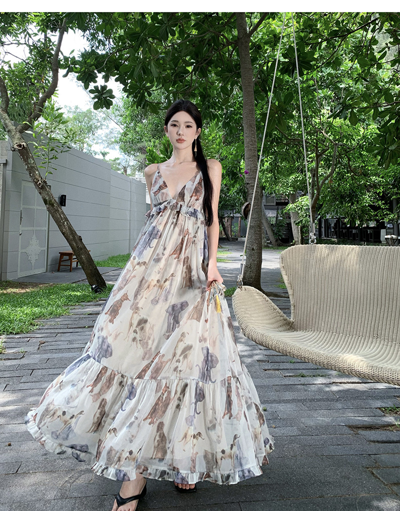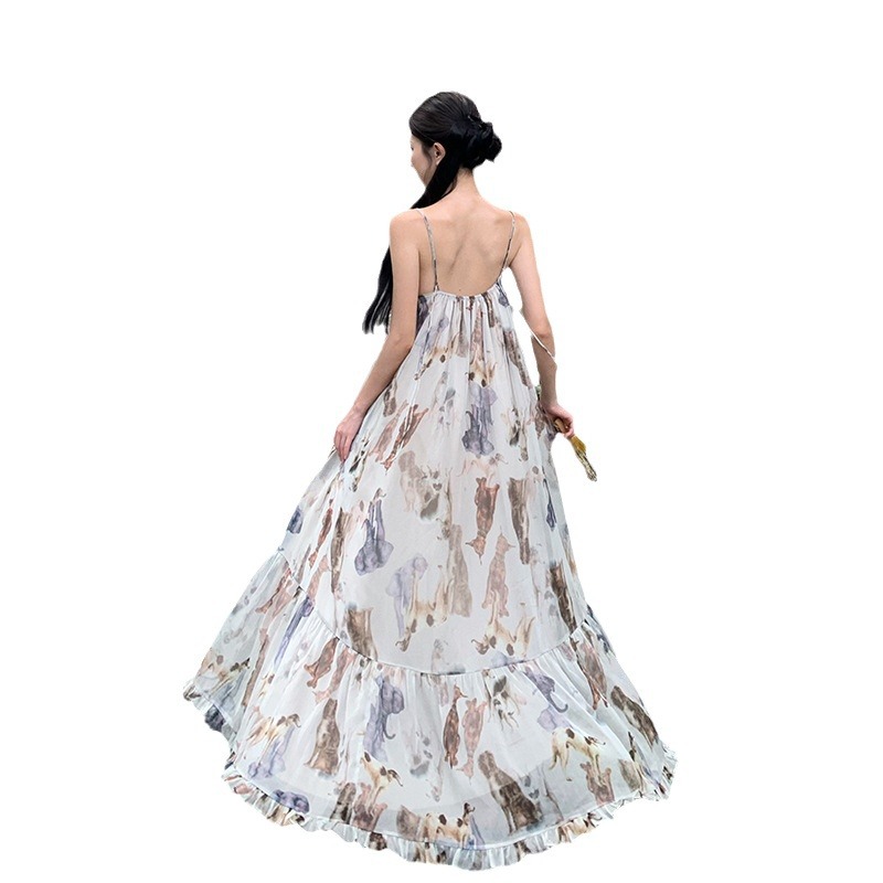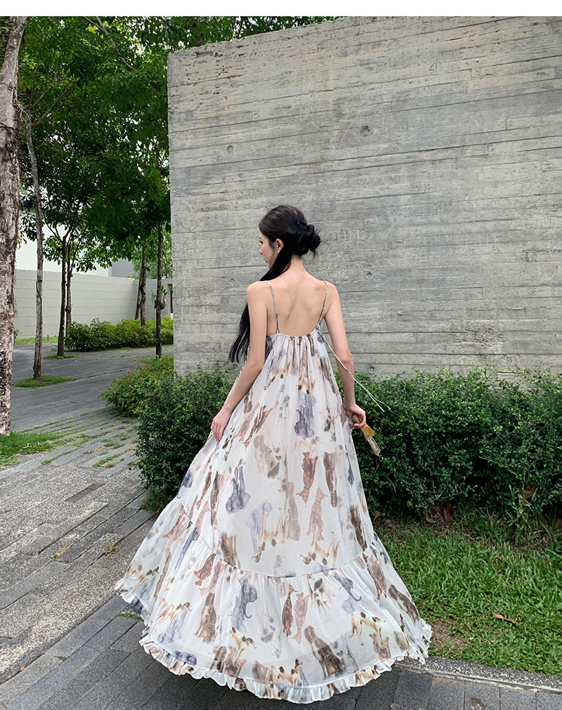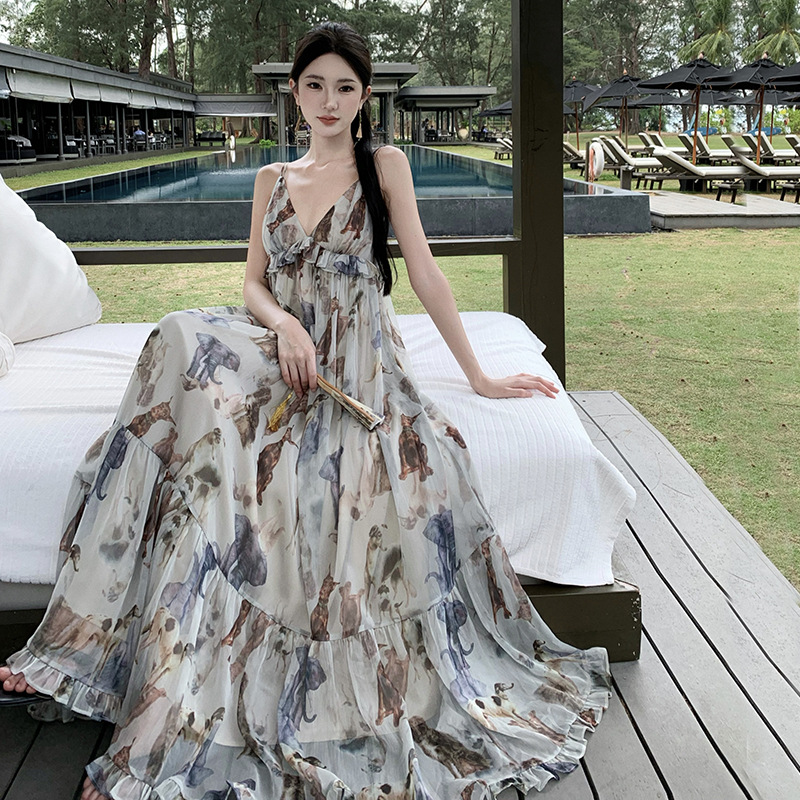丛林假日 雪纺印花度假吊带长裙露背飘逸仙女连衣裙