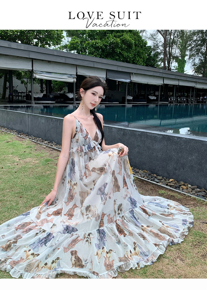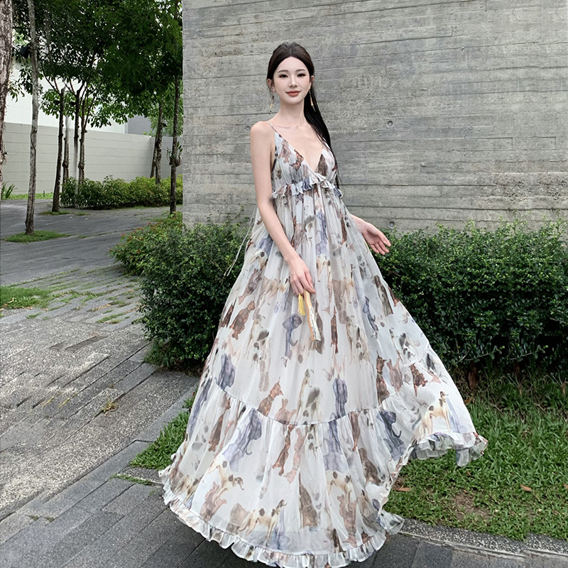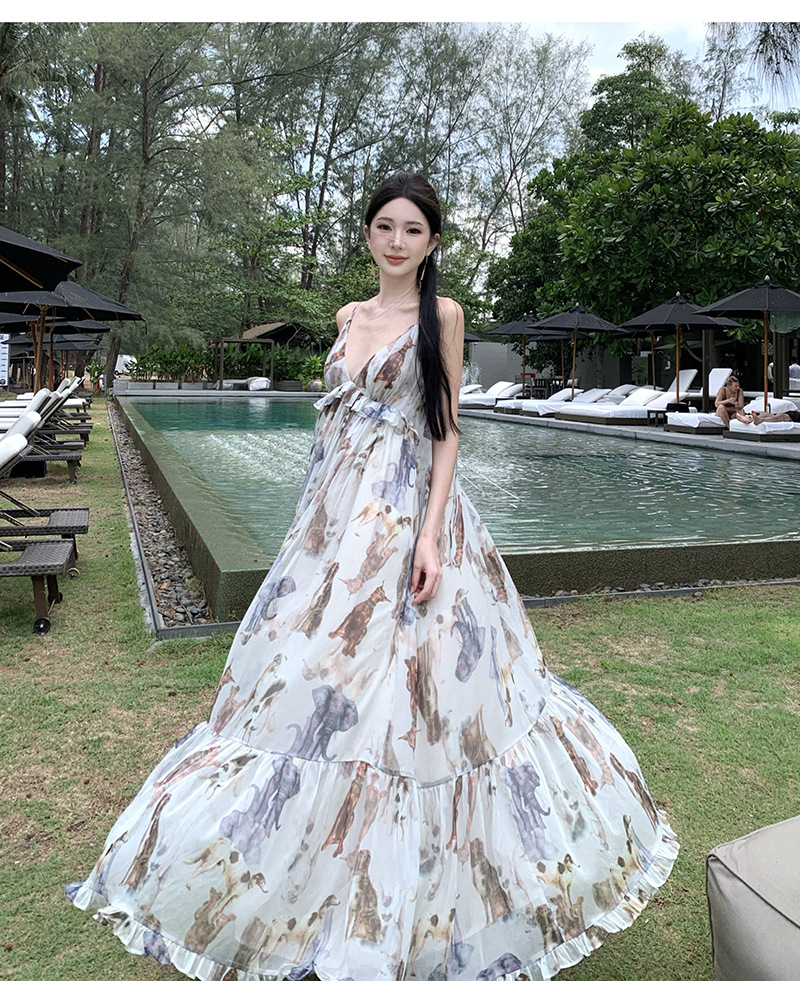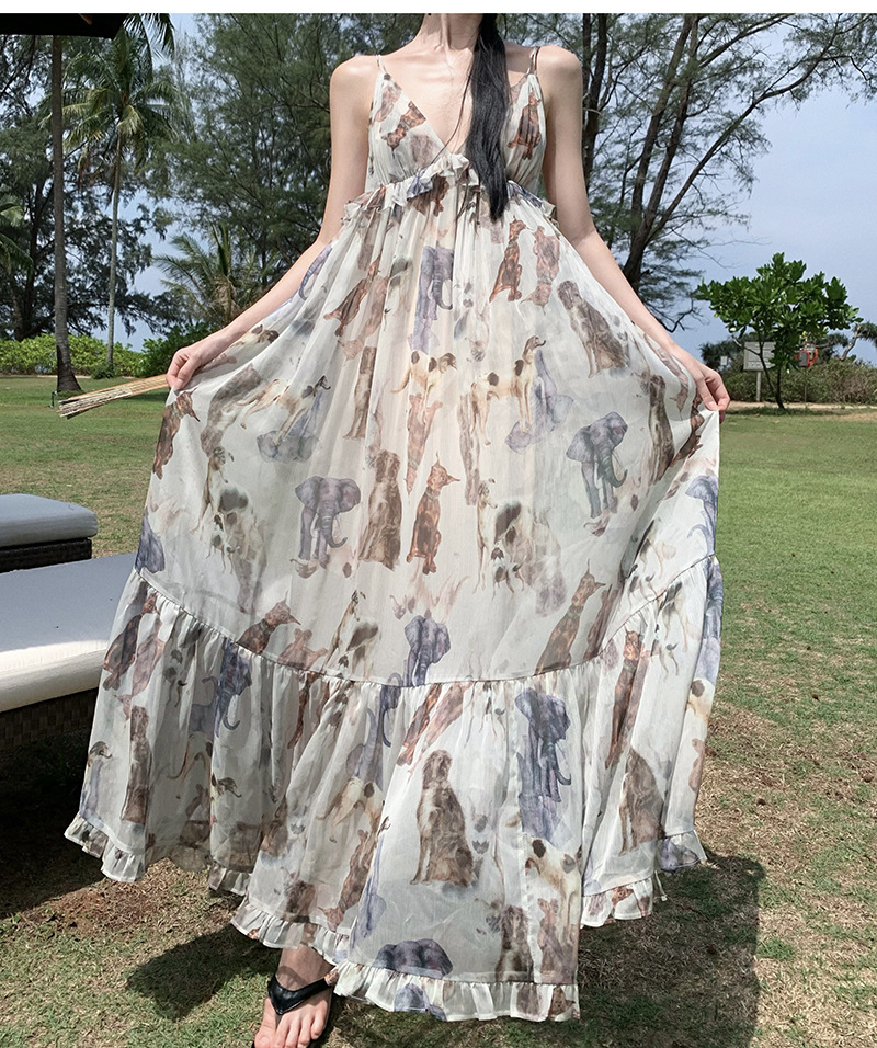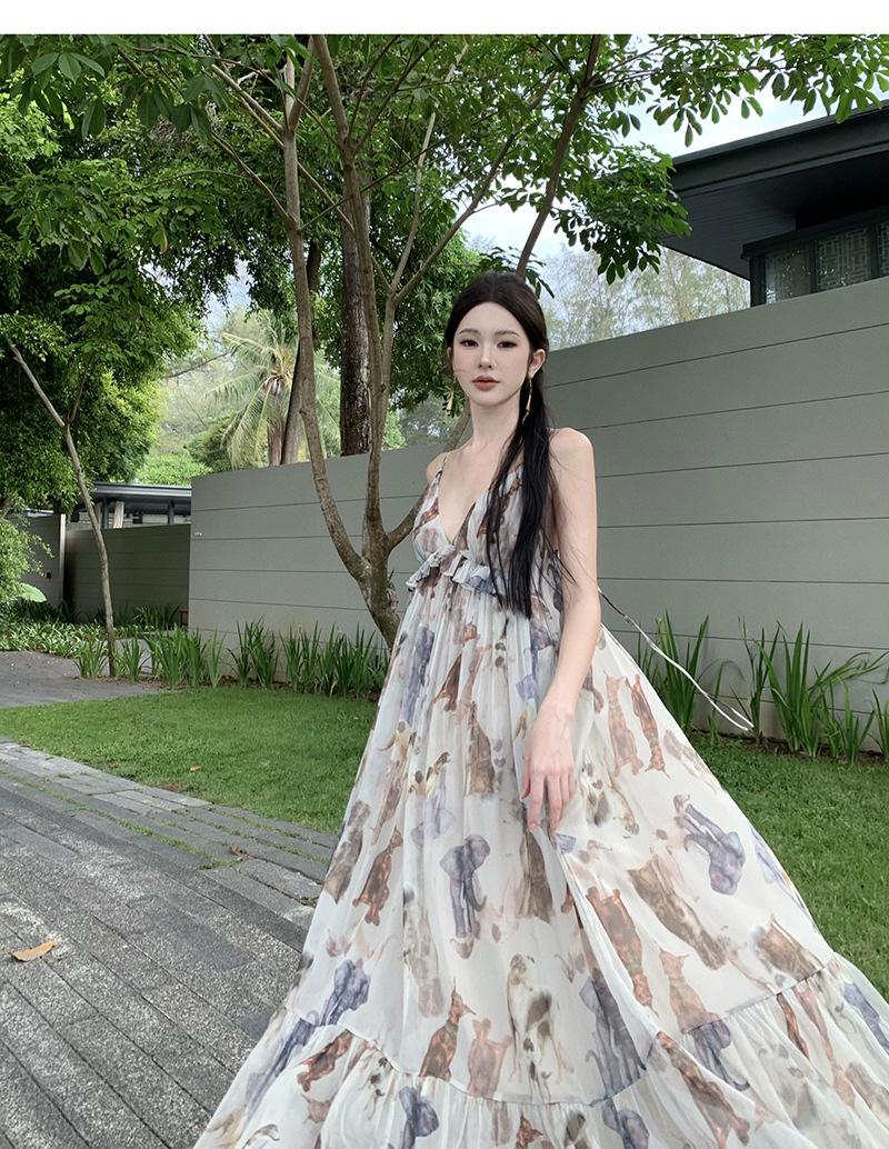 丛林假日 雪纺印花度假吊带长裙露背飘逸仙女连衣裙