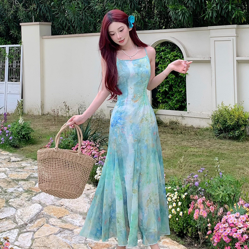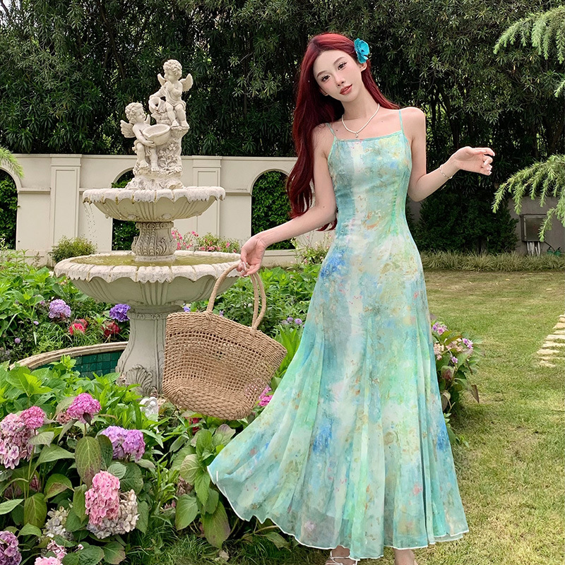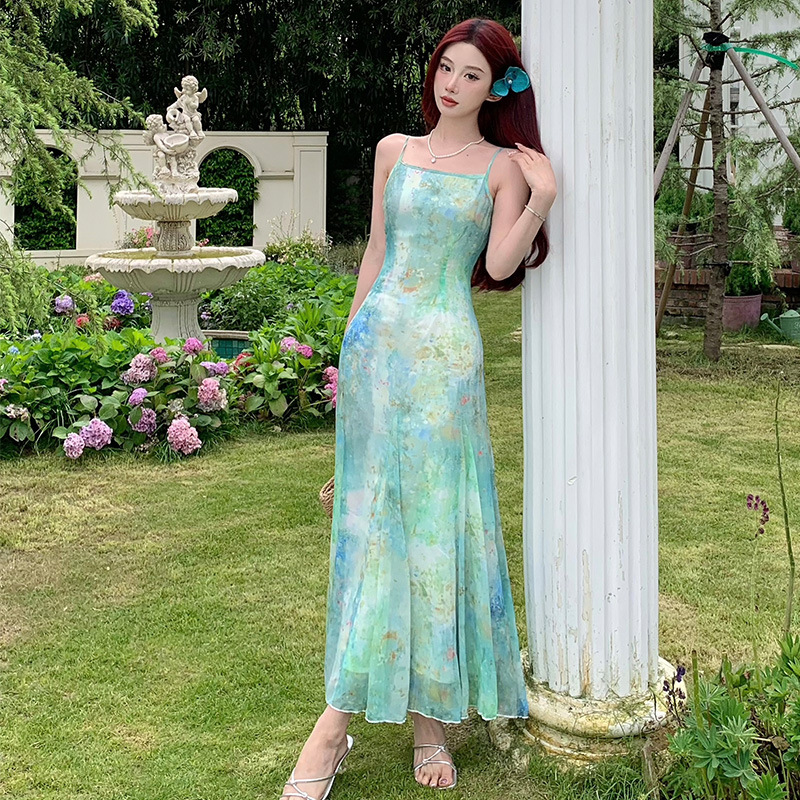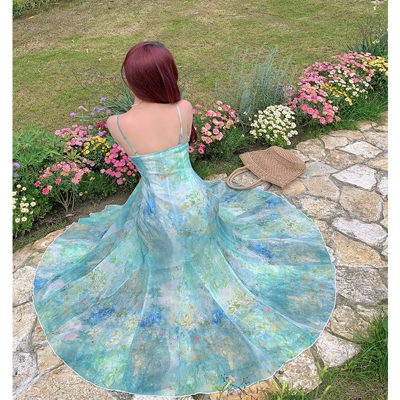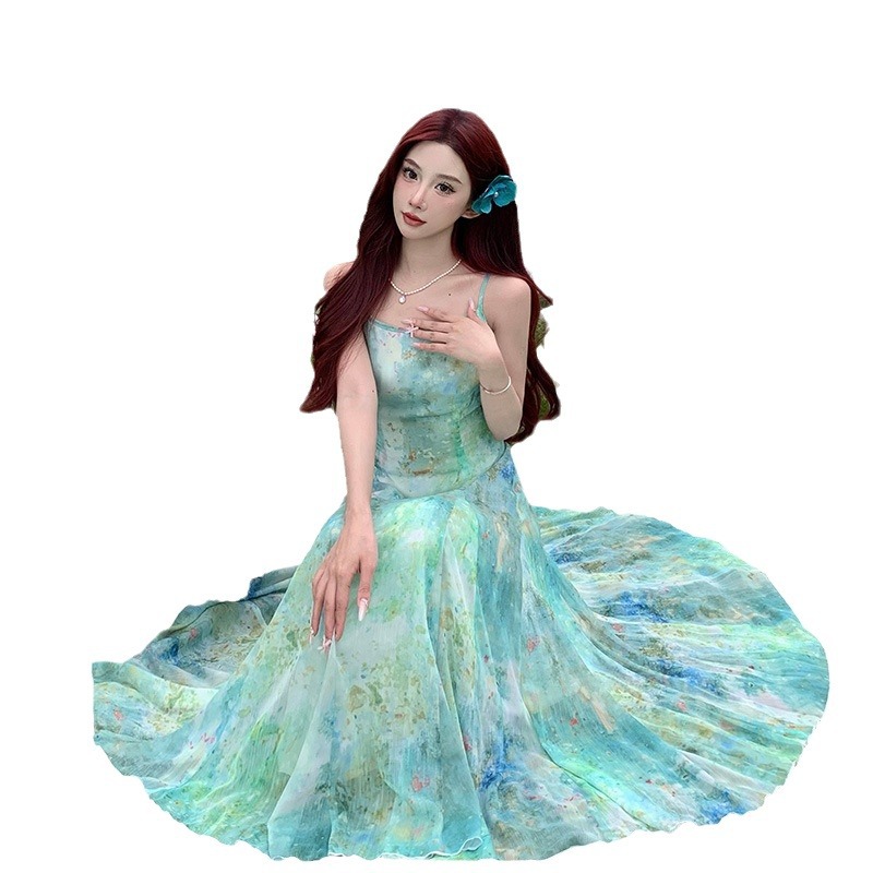 在逃人鱼公主吊带连衣裙女夏海边度假沙滩收腰鱼尾长裙