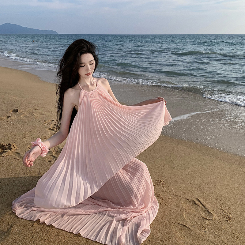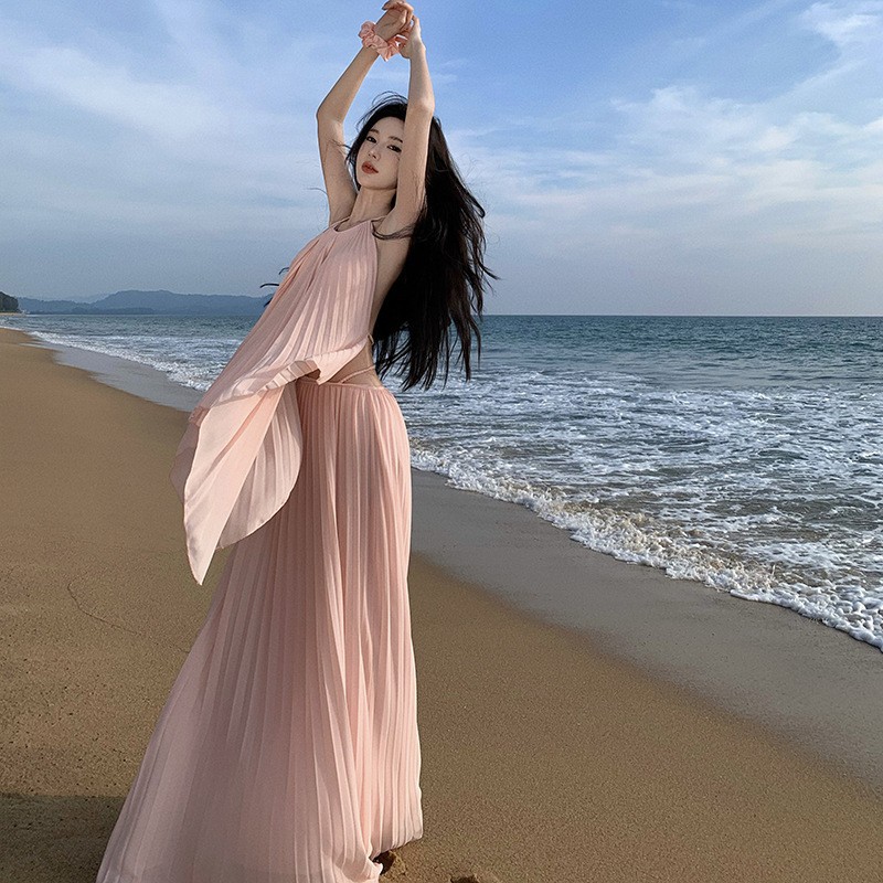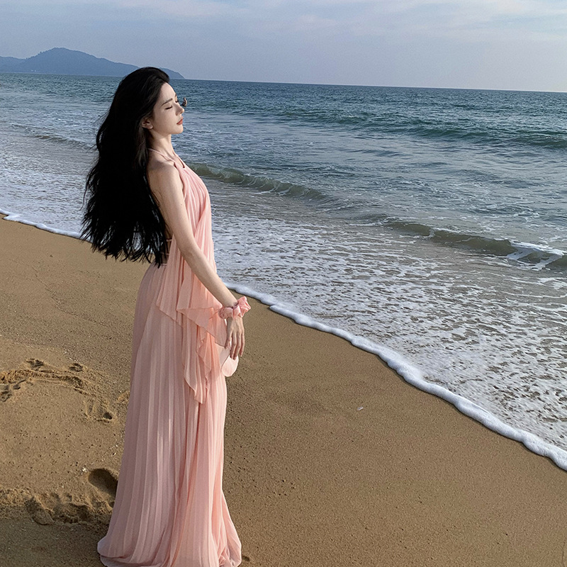 粉色海边度假长裙高级氛围拍照女神穿搭大摆飘逸仙气套装裙