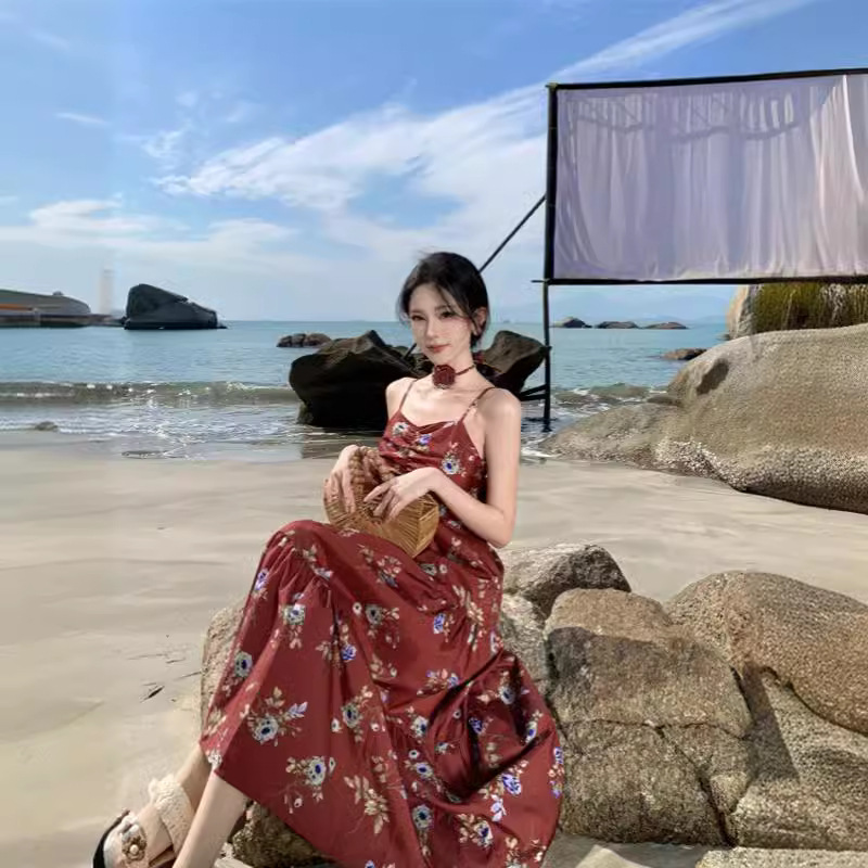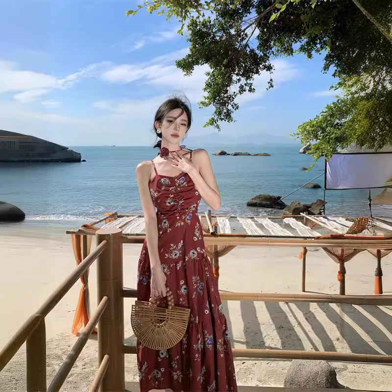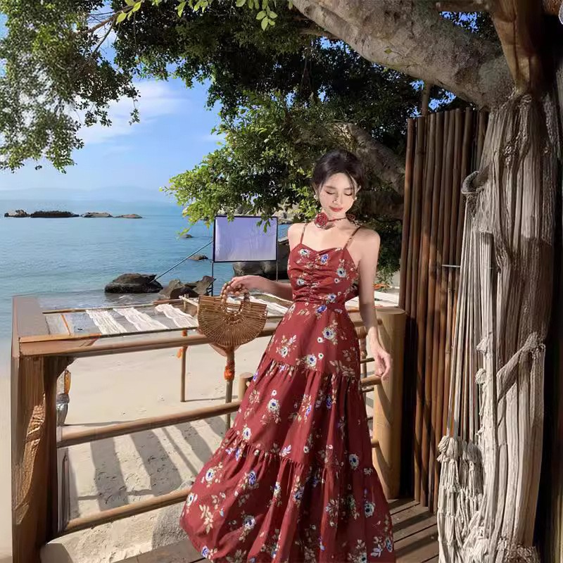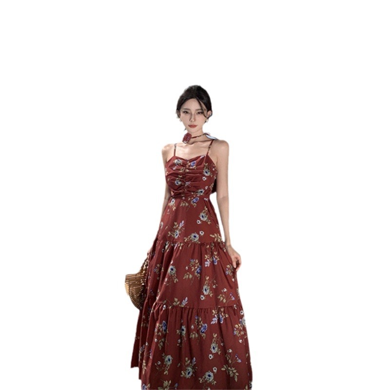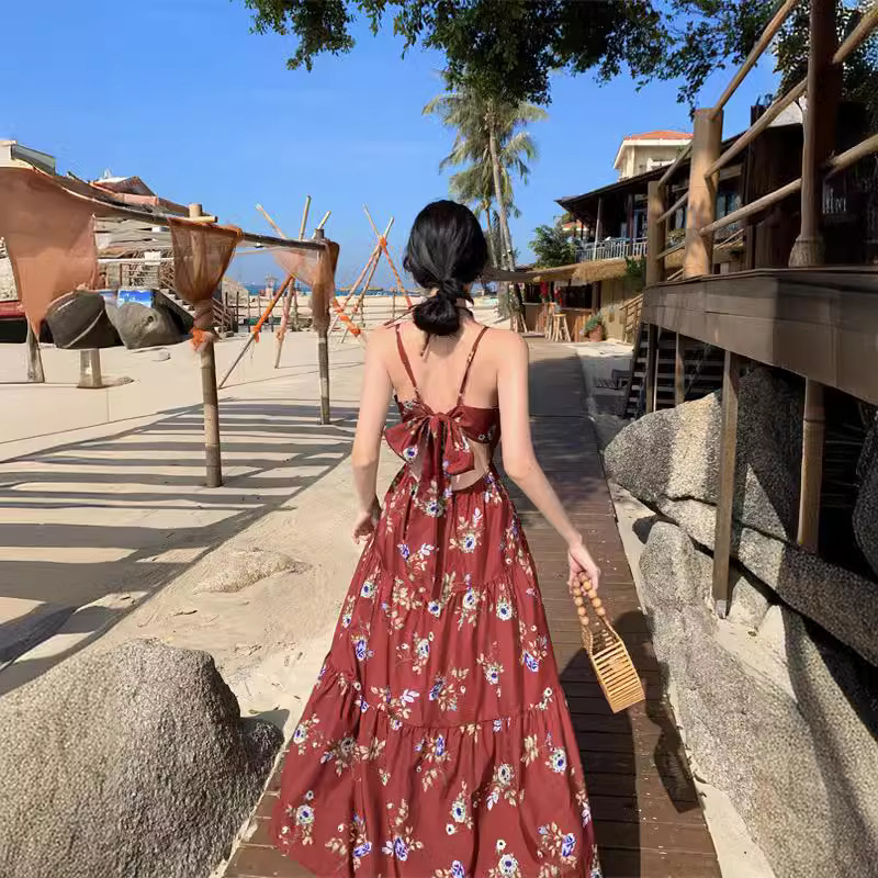 复古设计感露背蝴蝶结连衣裙女度假风显瘦百搭碎花吊带长裙