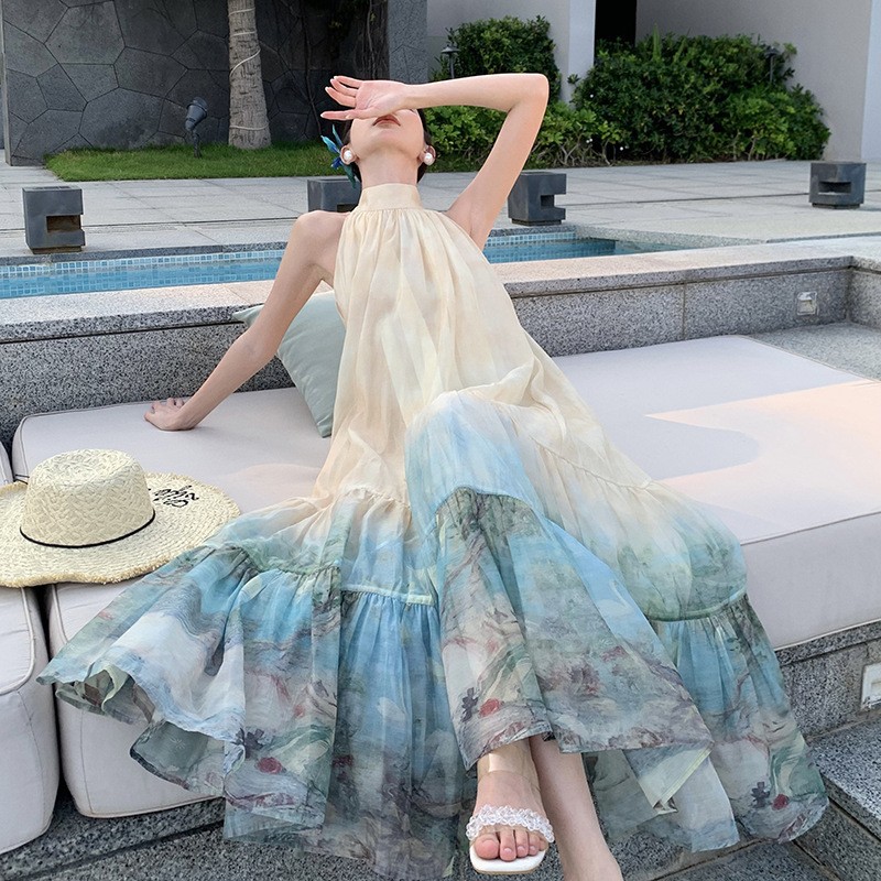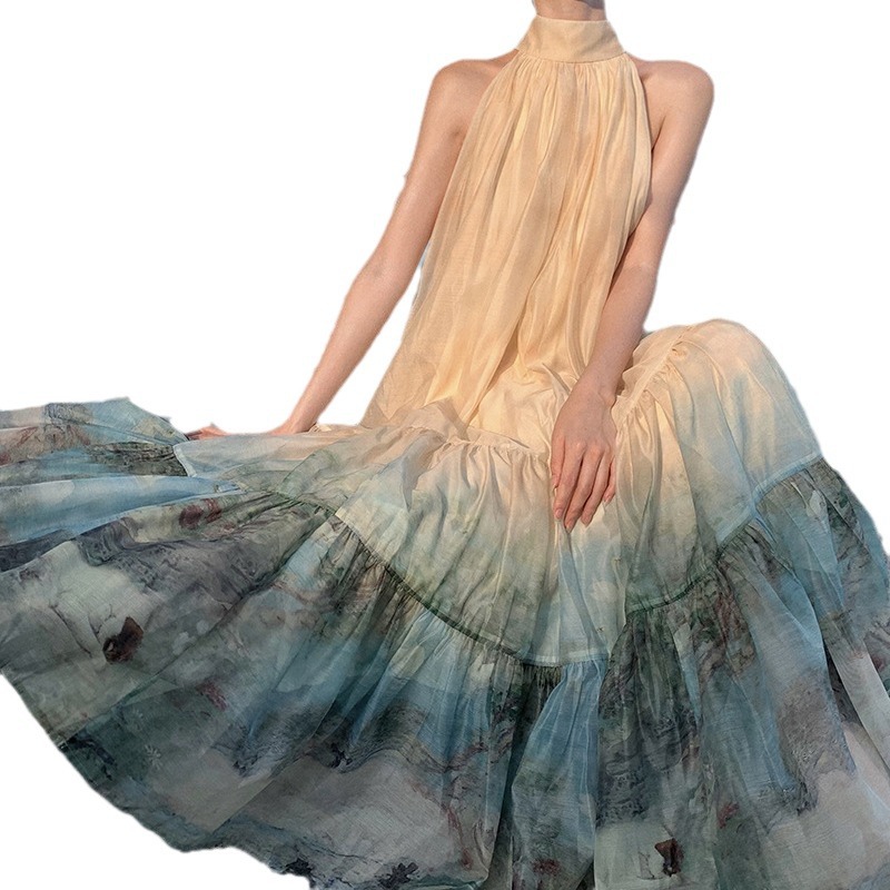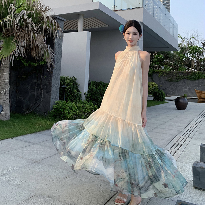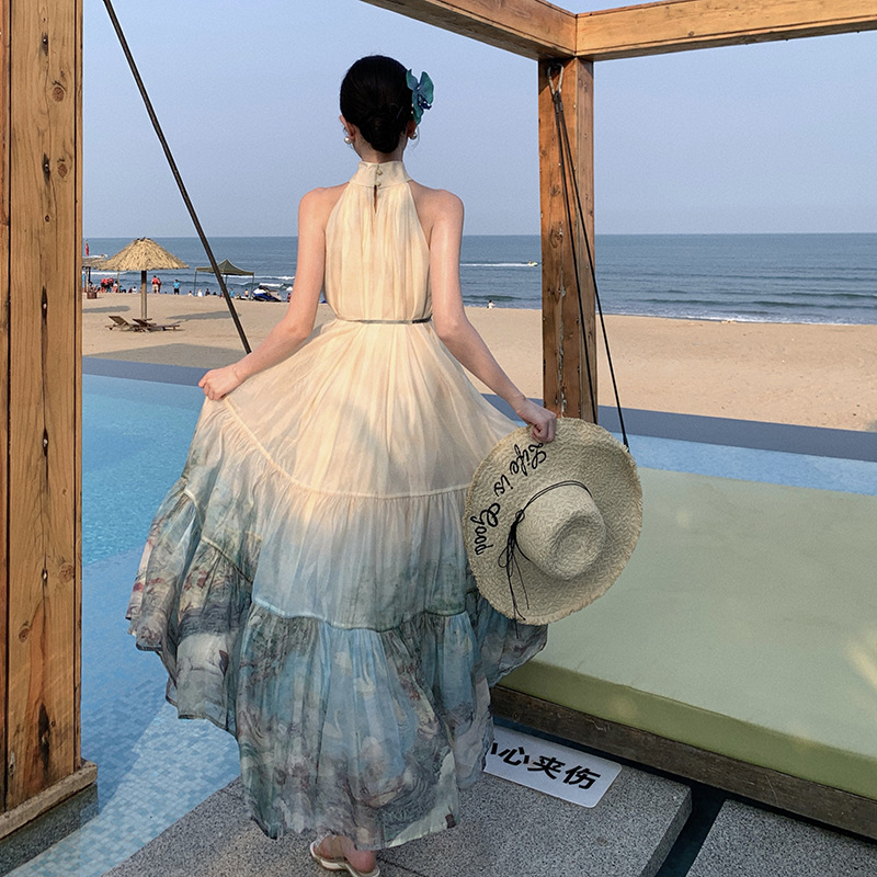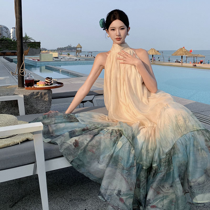 新中式国风印花连衣裙挂脖长裙度假大摆半裙