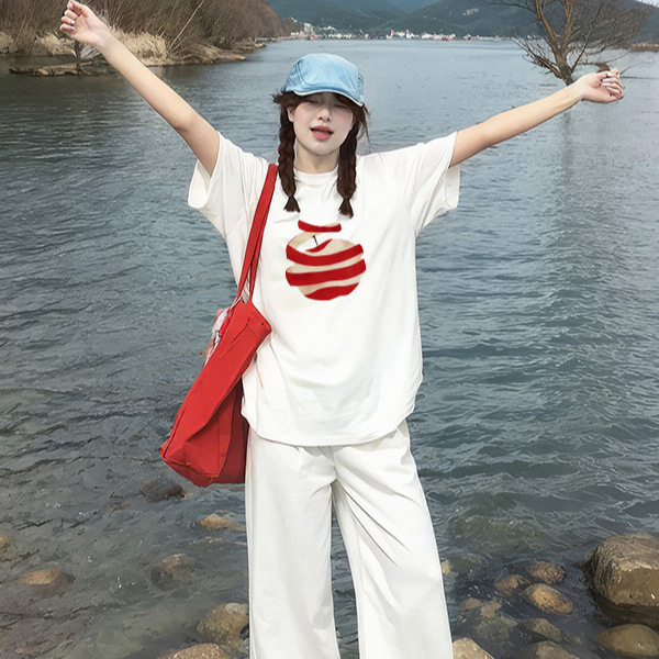 纯棉白色设计感苹果印花圆领短袖t恤女新款小众高级感宽松上衣夏