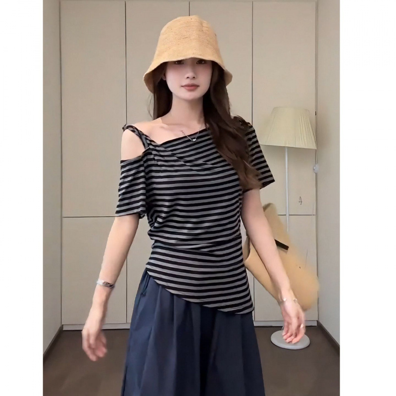 韩系条纹吊带斜肩短袖T恤女夏季性感掐腰不规则修身显瘦辣妹上衣