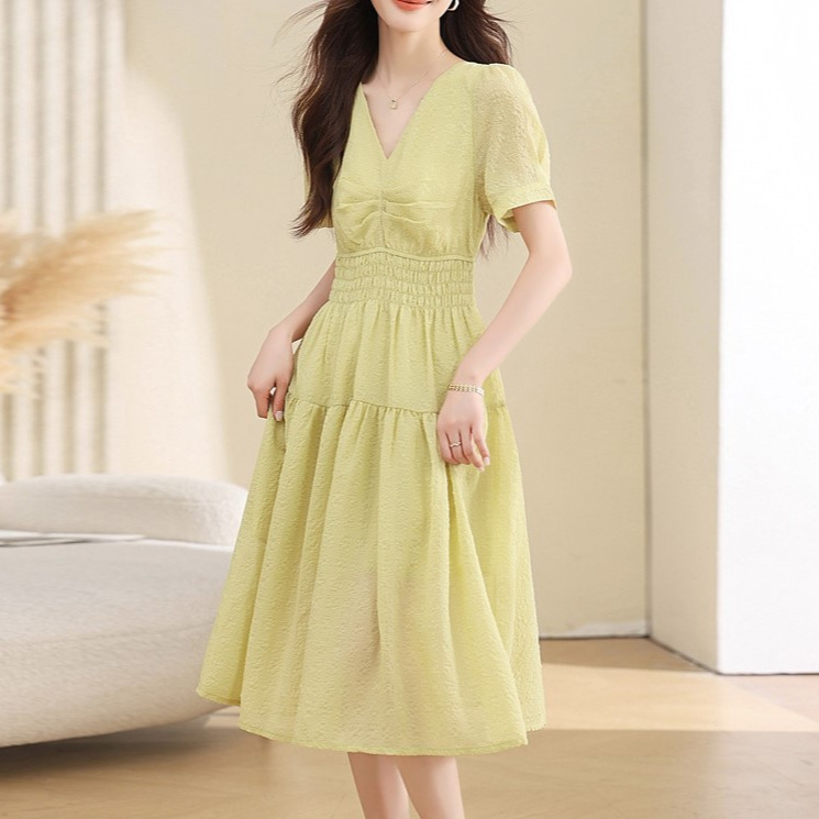茶歇法式绿色连衣裙女夏季新款气质温柔风V领收腰绝美仙女裙子