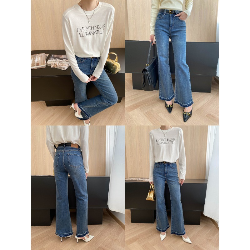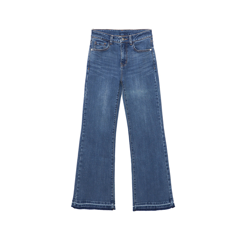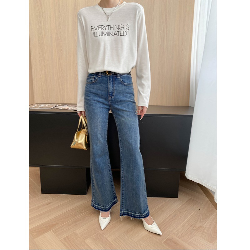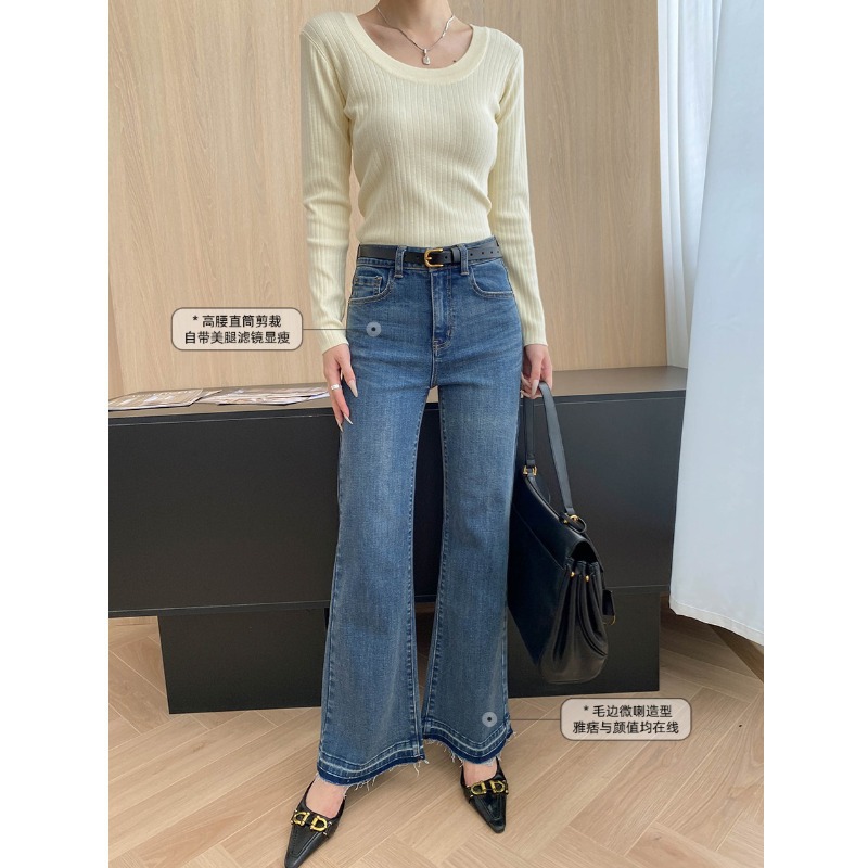 司南时髦精挚爱水洗复古高腰直筒撞色毛边微喇叭牛仔裤