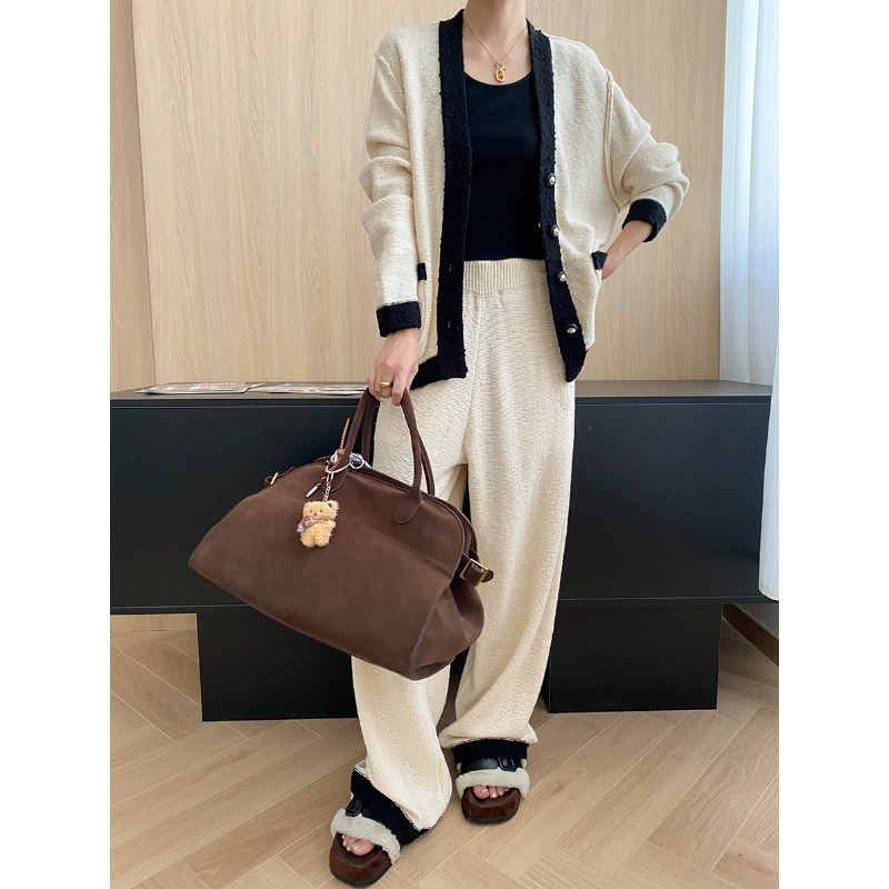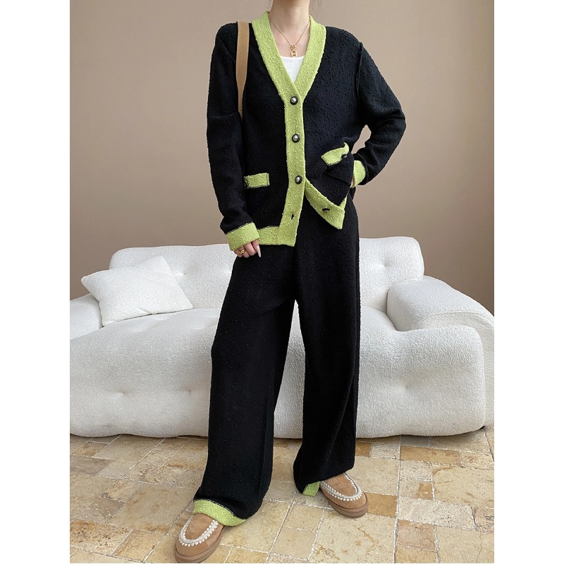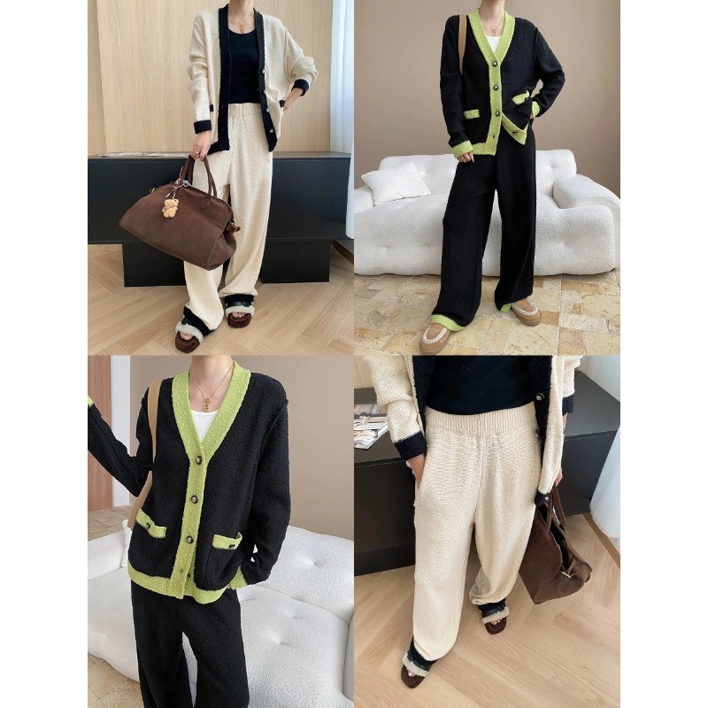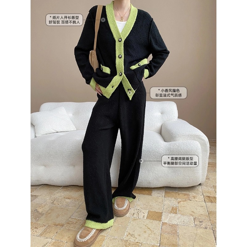 司南老钱风松弛感法式小香风撞色针织开衫阔腿裤两件套