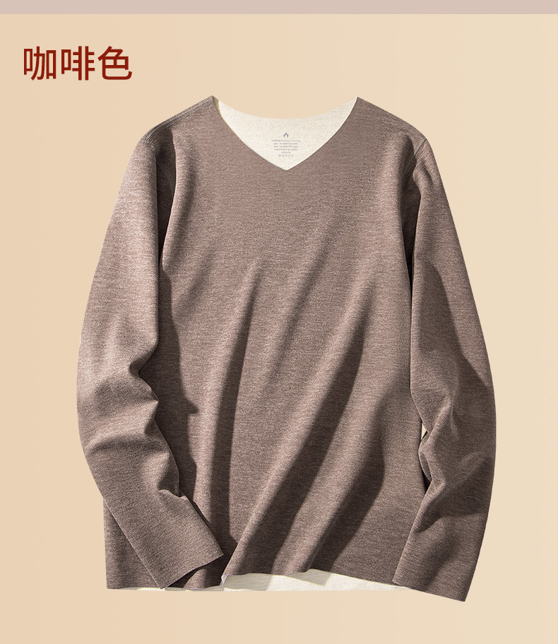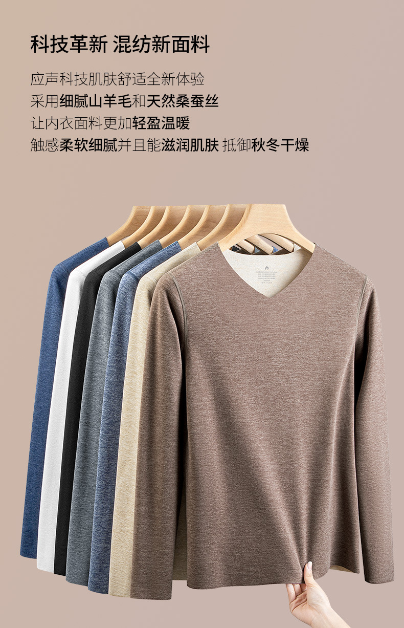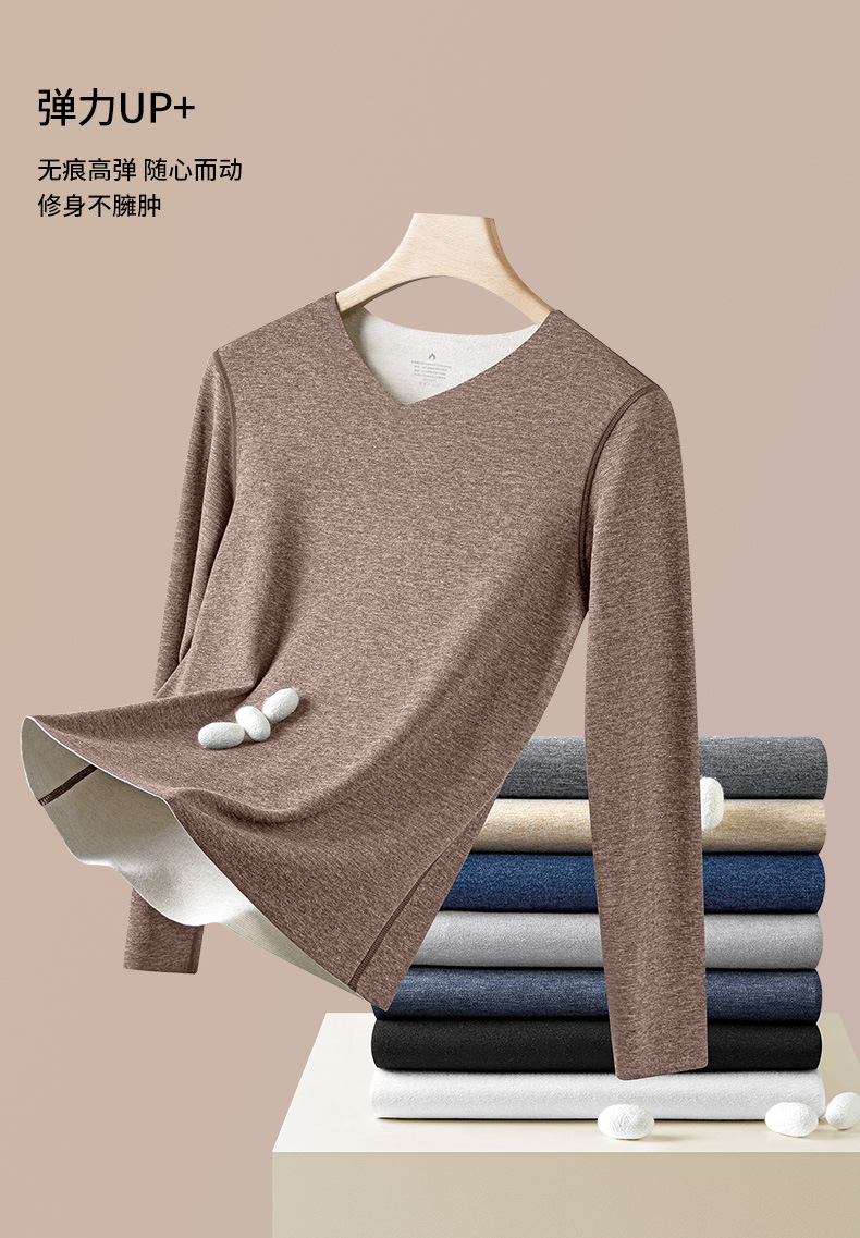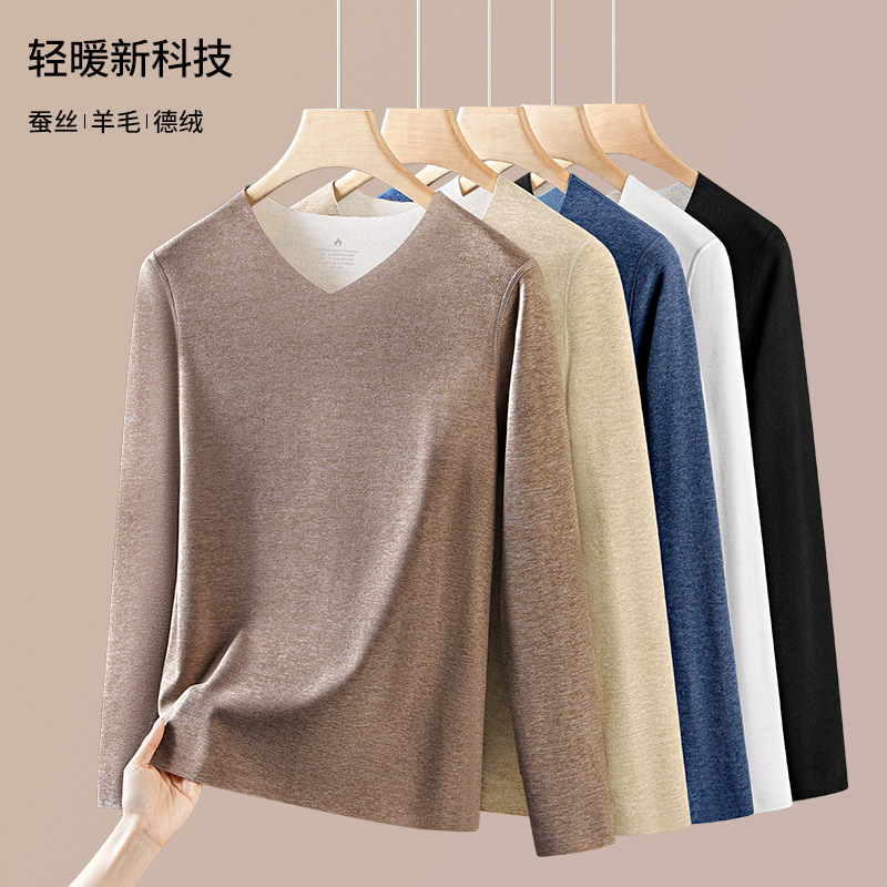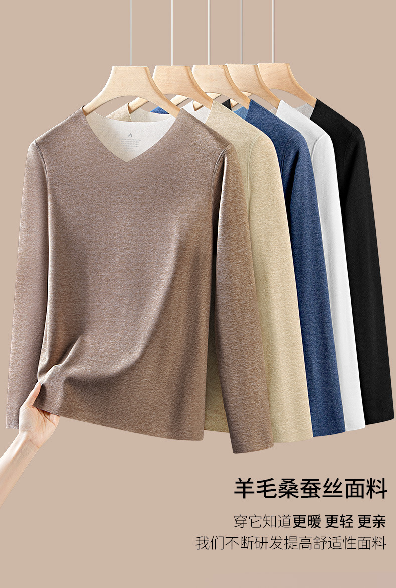 羊毛桑蚕丝德绒无痕保暖加绒内衣男士长袖t恤秋冬季新款v领打底衫