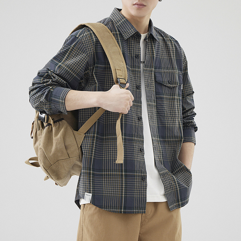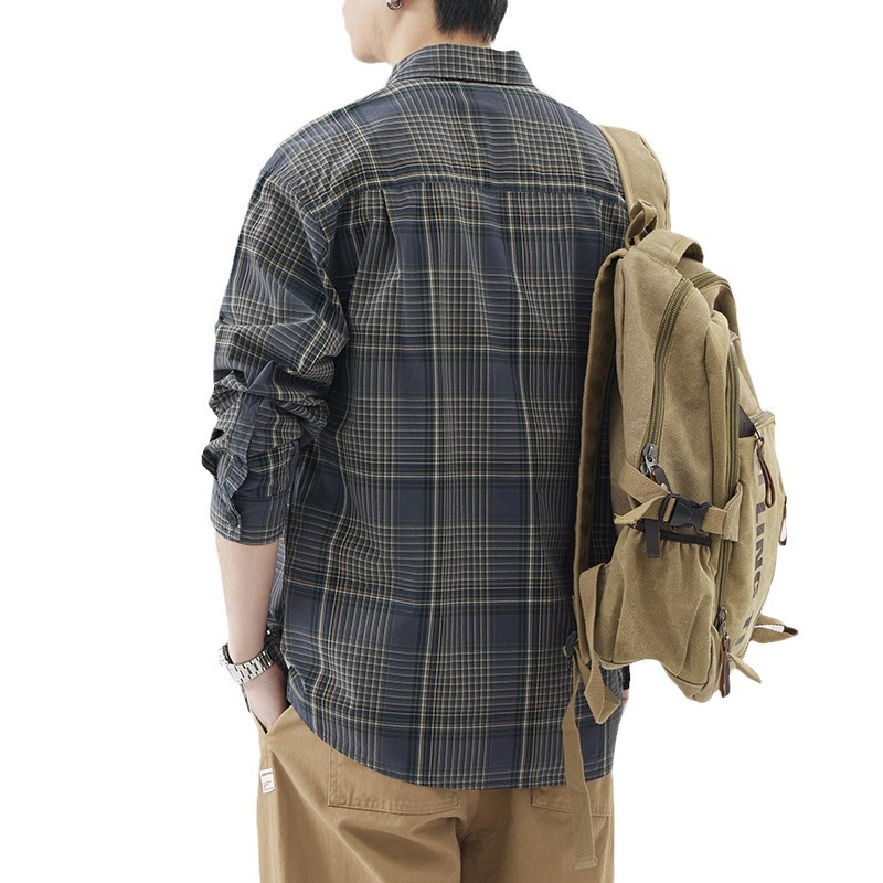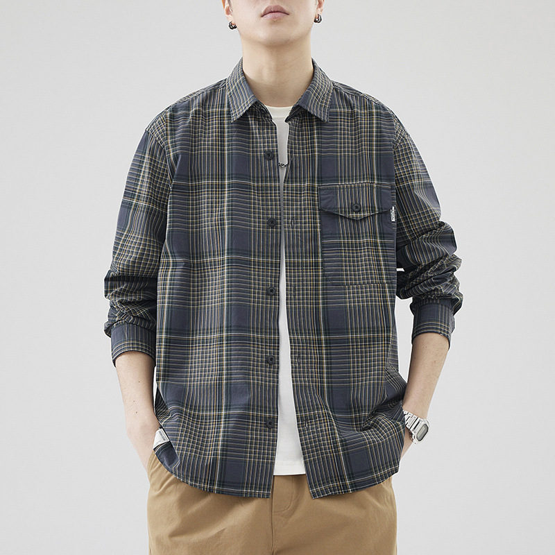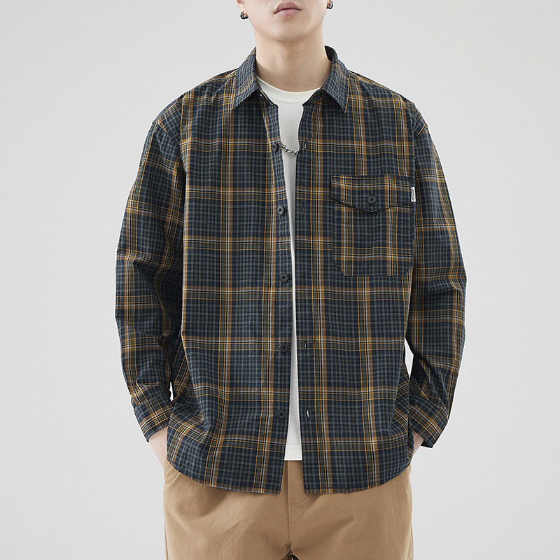 LKTM男装#日系复古洗水格子长袖衬衫男春季韩版潮牌宽松衬衣外套