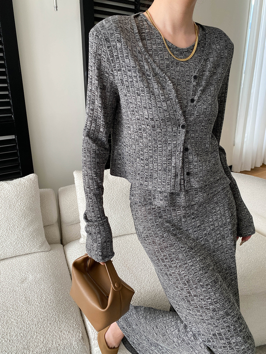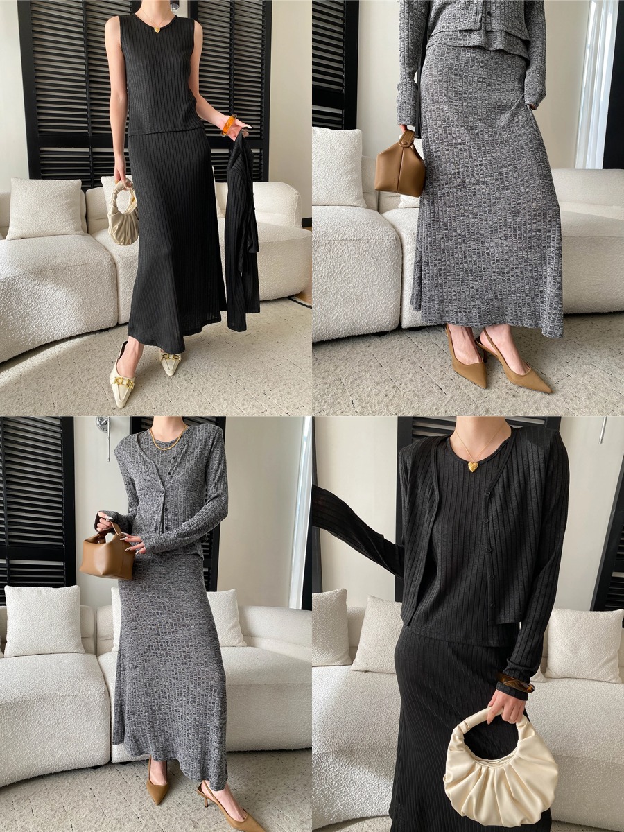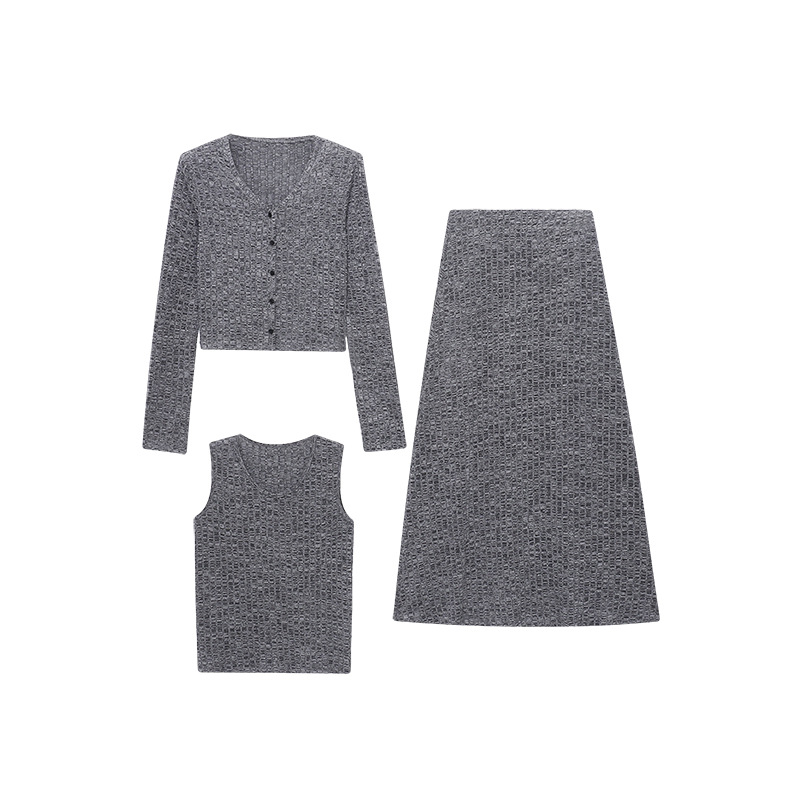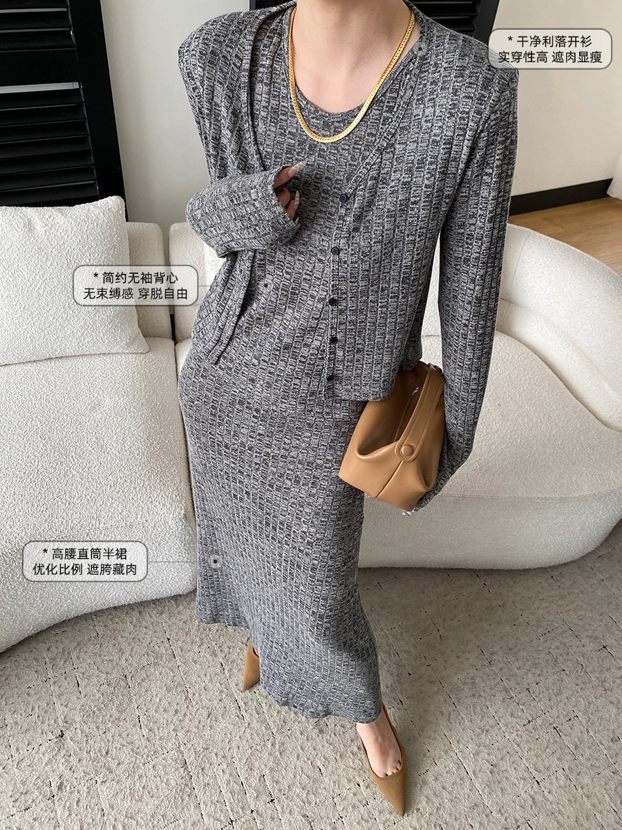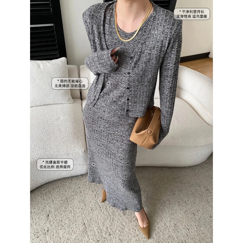 司南松弛随性慵懒坑条肌理长袖开衫背心半身裙三件套装