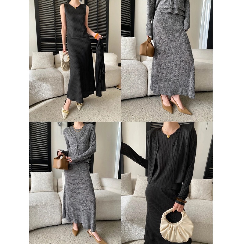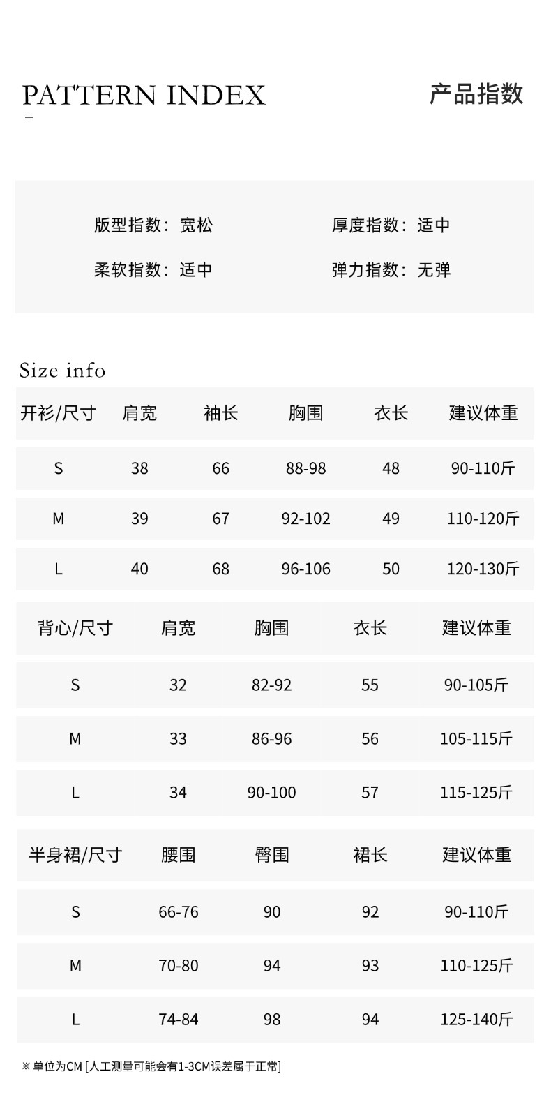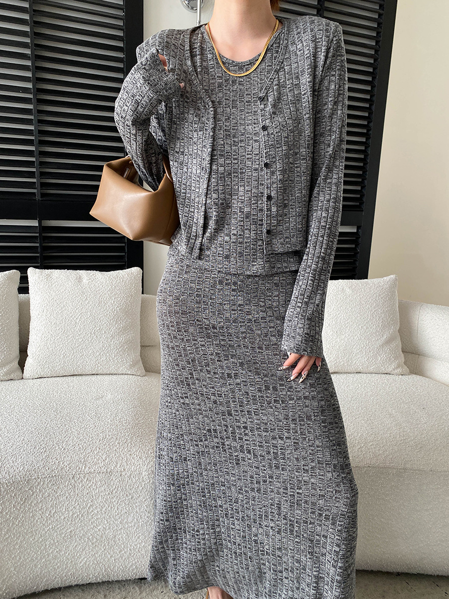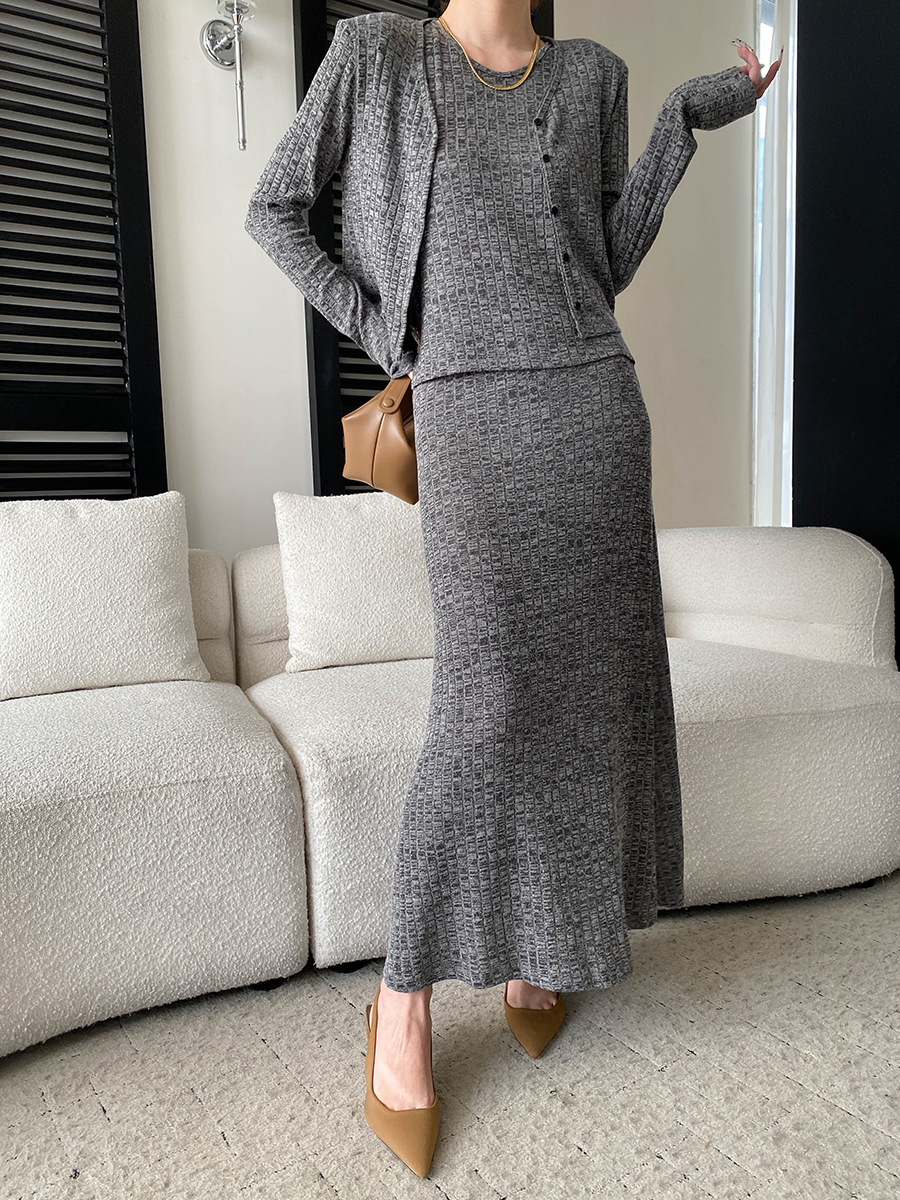 司南松弛随性慵懒坑条肌理长袖开衫背心半身裙三件套装
