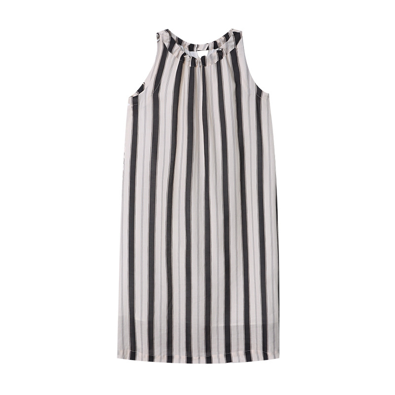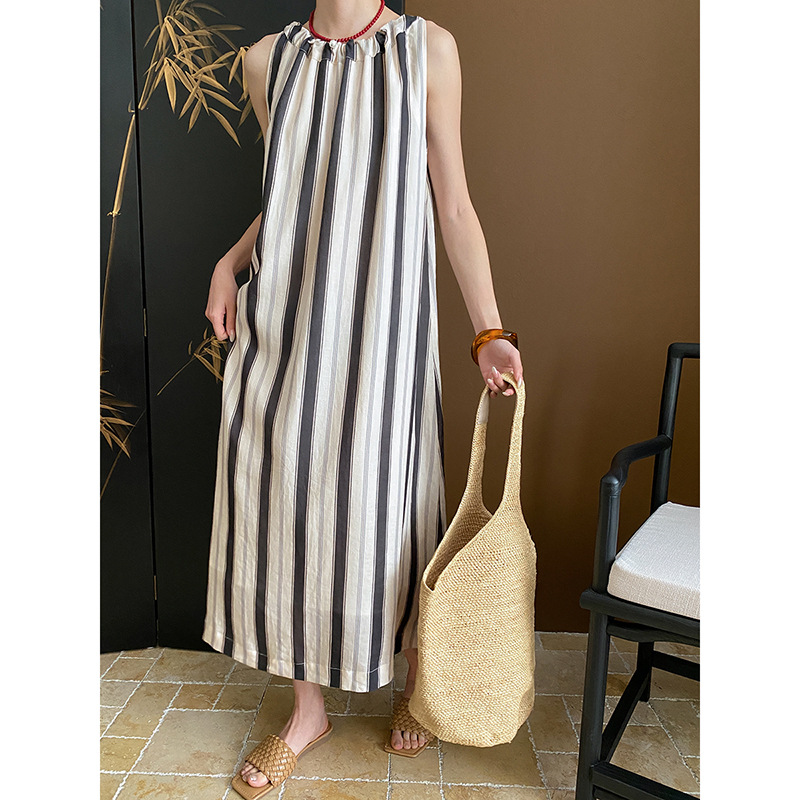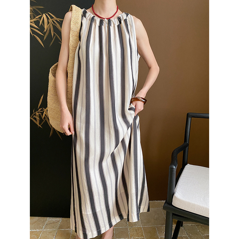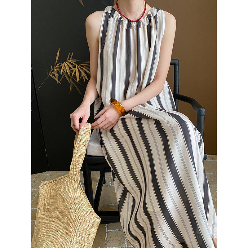 司南老钱天丝麻法式气质宽松显瘦麻袋竖条纹挂脖连衣裙